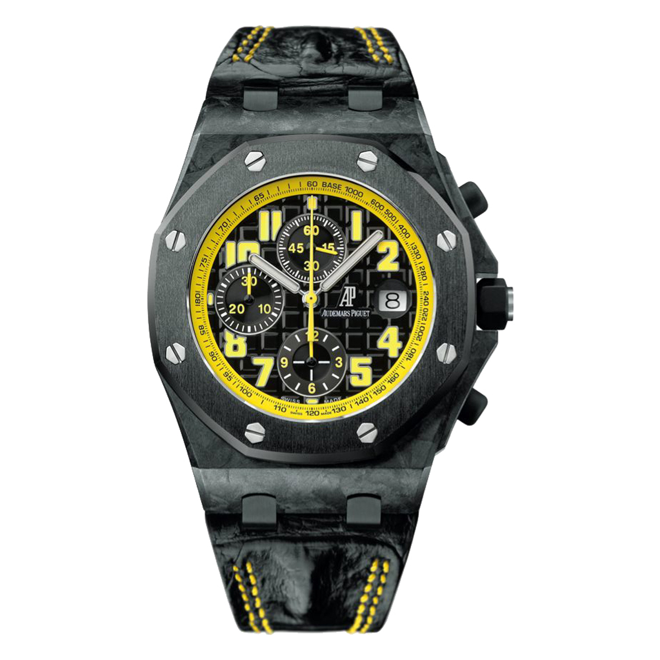 The Audemars Piguet Royal Oak Offshore “Bumble Bee” 26176FO.OO.D101CR.02 is a 42mm special edition chronograph crafted from forged carbon with a black ceramic bezel and bold yellow-accented dial. Powered by the automatic Calibre 3126/3840, it offers precision performance with a 60-hour power reserve. Featuring a scratch-resistant sapphire crystal, 100m water resistance, and a black alligator leather strap, this luxury timepiece blends cutting-edge design with signature Royal Oak Offshore style.