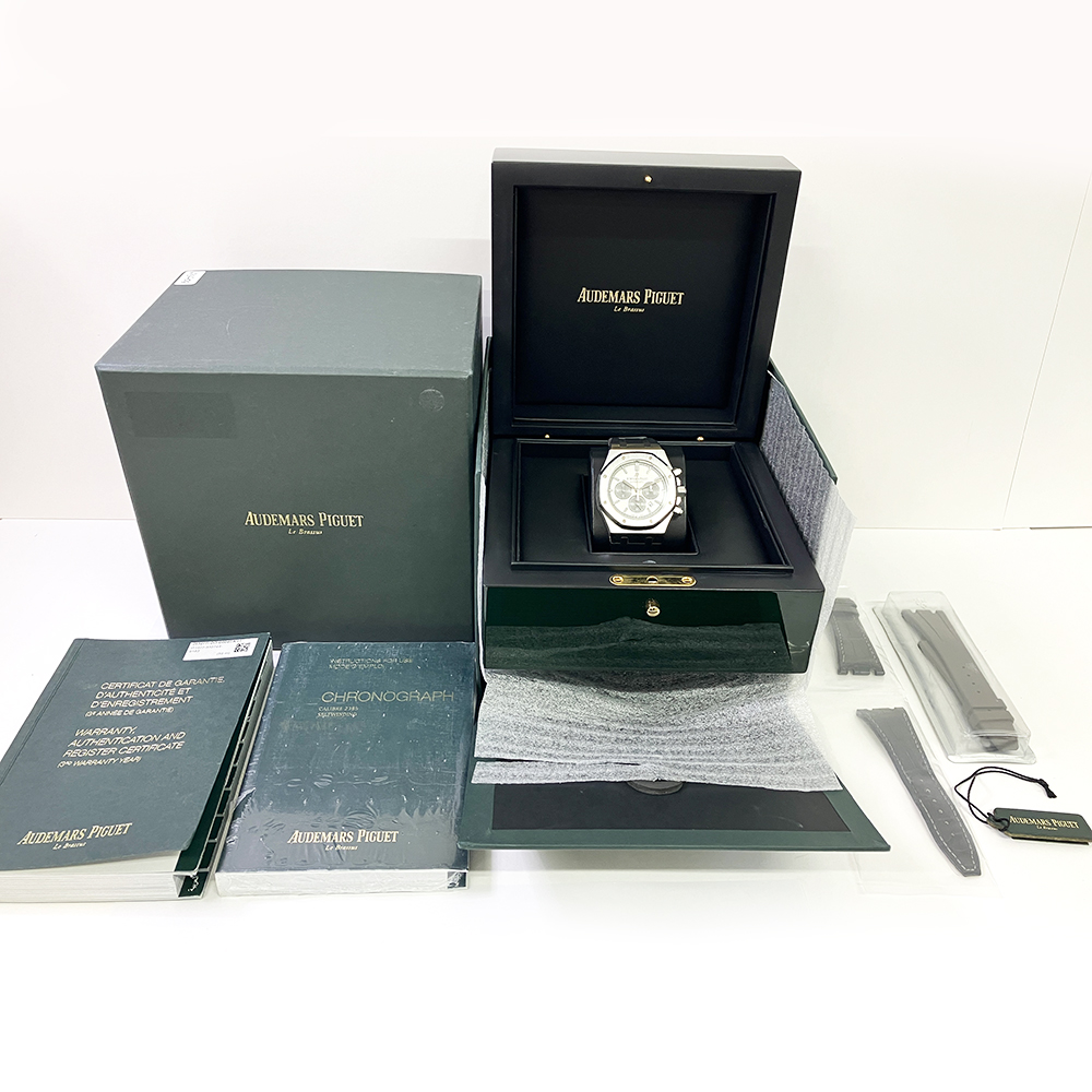 Grey titanium case with a blackrubber strap. 8 screws fixed grey bezel. Silver dial with silver-tone hands and index hour markers. Minute markers around the outer rim. Dial Type: Analog. Luminescent hands and markers. Date display between 4 and 5 o’clock position. Chronograph – three sub-dials displaying: 60 second, 30 minute and 12 hours. Audemars Piguet Calibre 2385 Automatic movement, containing 37 Jewels, composed of 304 parts, bitting at 21600 vph, and has a power reserve of approximately 40 hours.