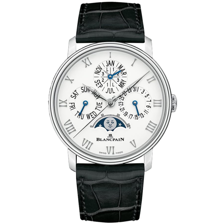 Stainless steel case with a black (crocodile) leather strap. Fixed stainless steel bezel. White dial with silver-tone hands and Roman numeral hour markers. Date markers (pointer date) around an inner ring. Dial Type: Analog. Month and day of the week display below the 12 o’clock position. Moonphase display. Blancpain calibre 6654 automatic movement, containing 28 Jewels, composed of 321 parts, bitting at 28800 vph, and has a power reserve of approximately 72 hours. Scratch resistant sapphire crystal.