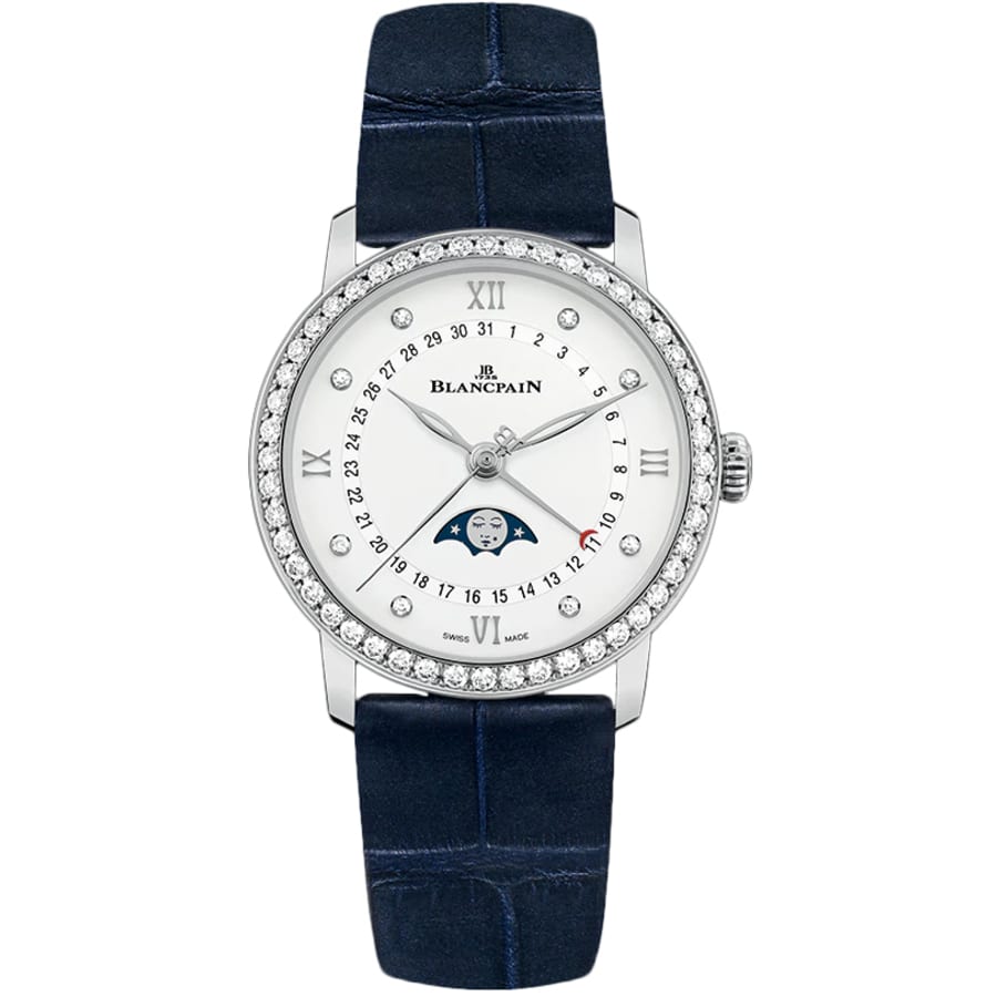 Silver-tone stainless steel case with blue alligator band. Fixed silver-tone bezel with diamond set. White dial with silver-tone hands and diamond-Roman numerals hour markers. Dial Type: Analog. Pointer date. One subdial displaying: moonphase. Blancpain Calibre 913QL.P Automatic movement, containing 29 Jewels, bitting at 21600 vph, and has a power reserve of approximately 40 hours.