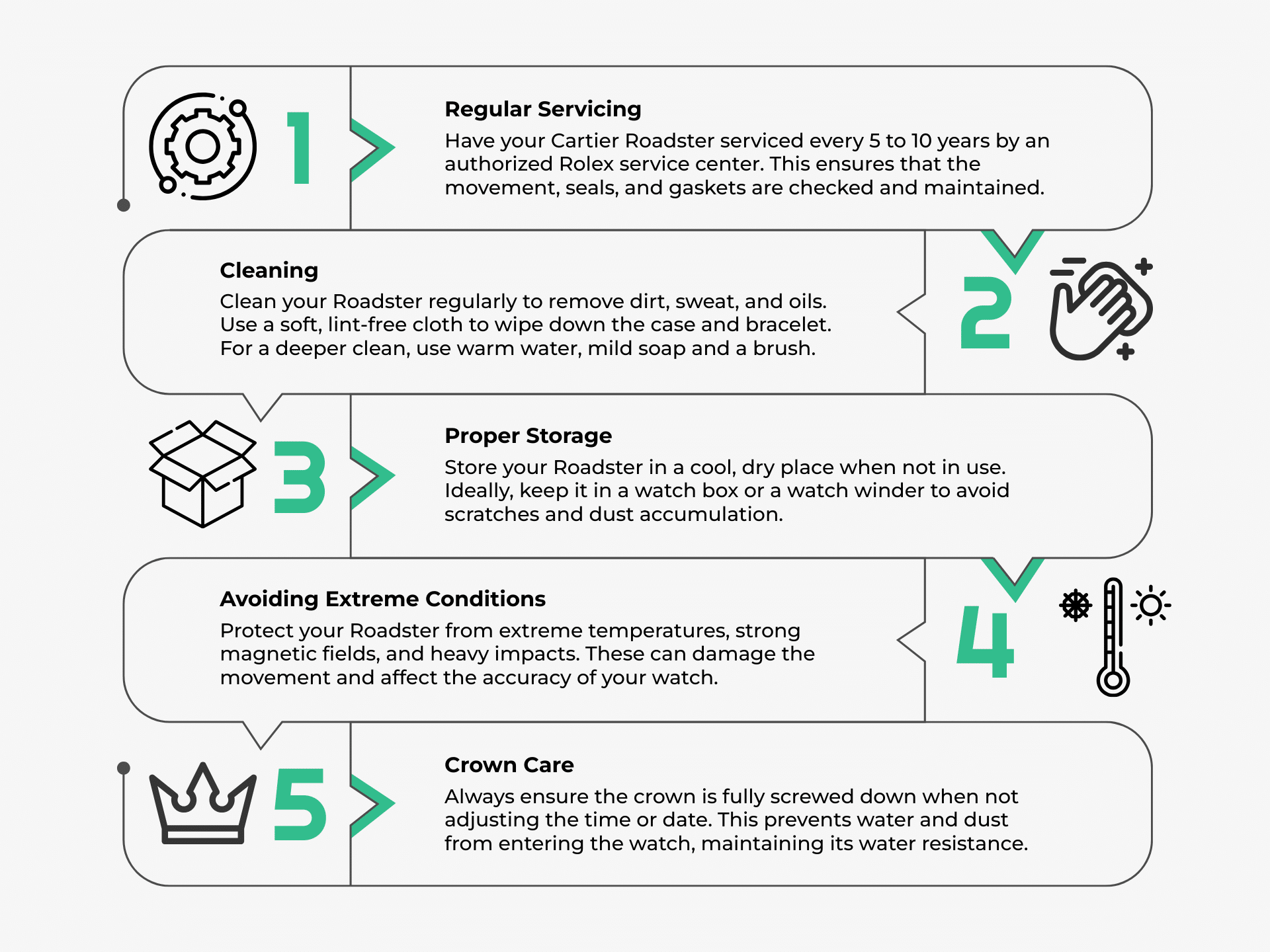 Is the Cartier Roadster water resistant? Yes, the Roadster collection features a screw-down crown that ensures water resistance up to 100 meters, making it optimal for daily wear and water activities.