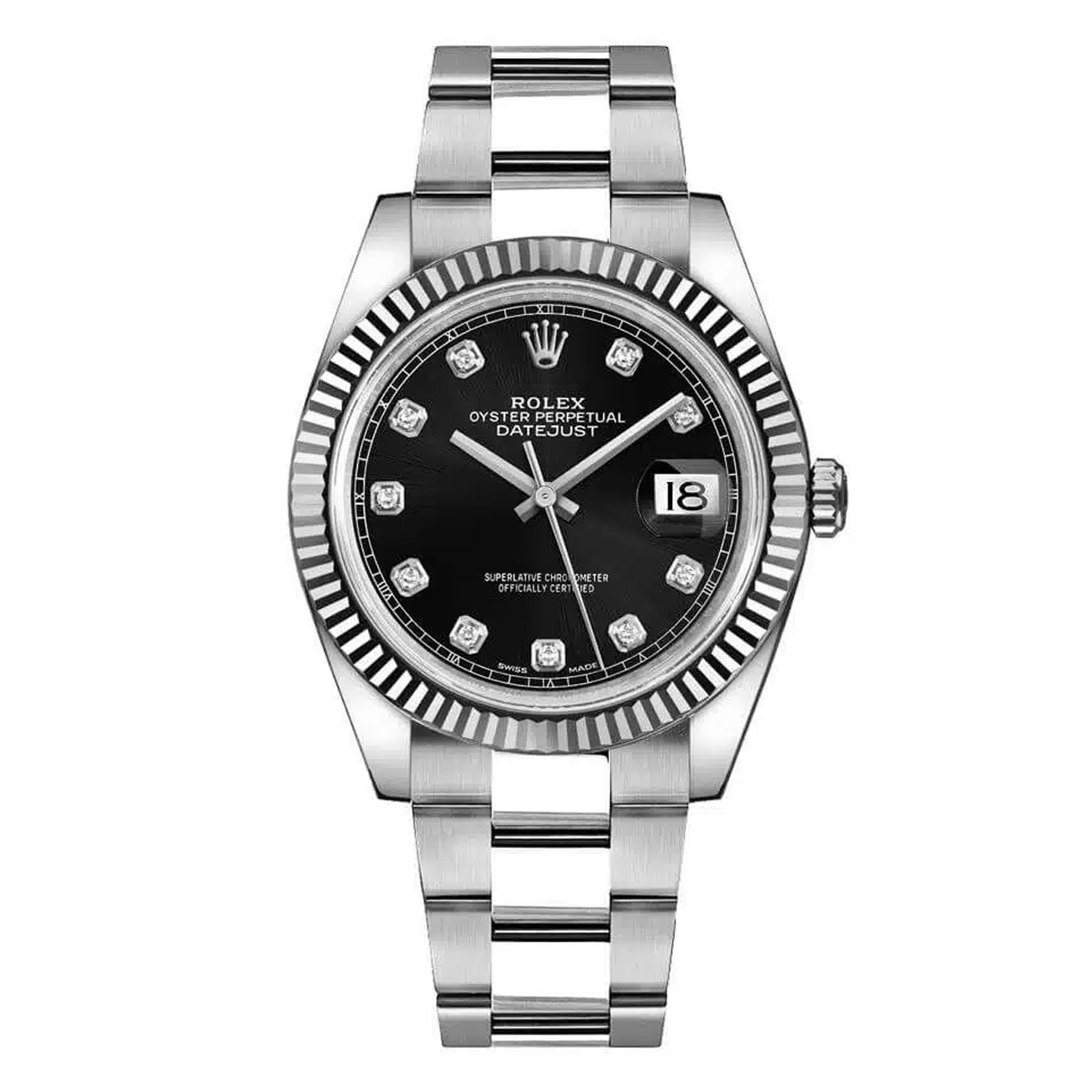 - Rolex Datejust 41 Black Dial Ref. 126334 – Features a white gold fluted bezel, luminous markers, and Oyster or Jubilee bracelet options.