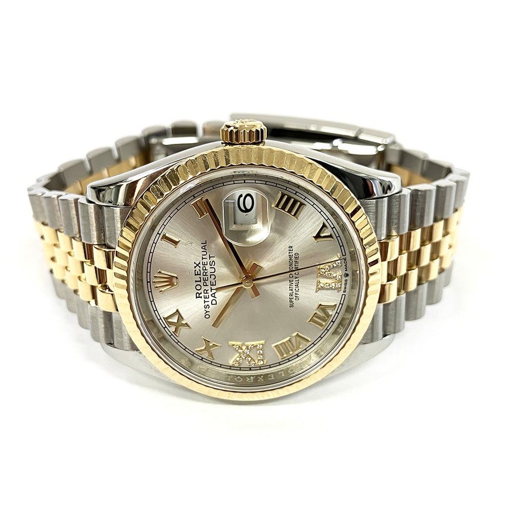 The Rolex Datejust 36 126233, gold and steel 36mm case with yellow gold bezel. Silver dial with yellow gold-tone hands and Roman numerals dial hour markers featuring VI & IX with diamond. Yellow gold and stainless steel Jubilee bracelet with gold/steel folded clasp. Scratch resistant saphire crystal. Powered by the reliable Rolex 3235 automatic caliber with an impressive 70-hour power reserve and housing 31 jewels. Water resistance of up to 10 ATM. Luxury watch style. Watch label: Swiss Made.
