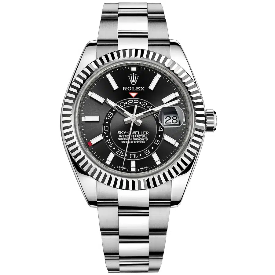 The black (Rolex calls it “bright black”) dial gives the Sky‑Dweller’s complex display maximum contrast: luminous indexes, red month apertures, off‑center 24‑hour disc, and that fluted Ring Command bezel that selects functions.