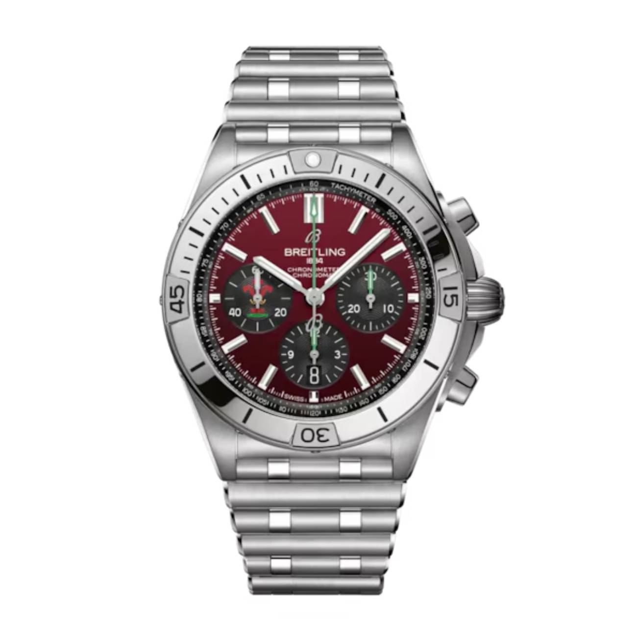 Breitling Chronomat B01 Six Nations Wales AB0134A61K1A1 42mm Red Dial Unidirectional, Ratcheted Rotating Bezel Stainless Steel and Silver Bracelet Watch