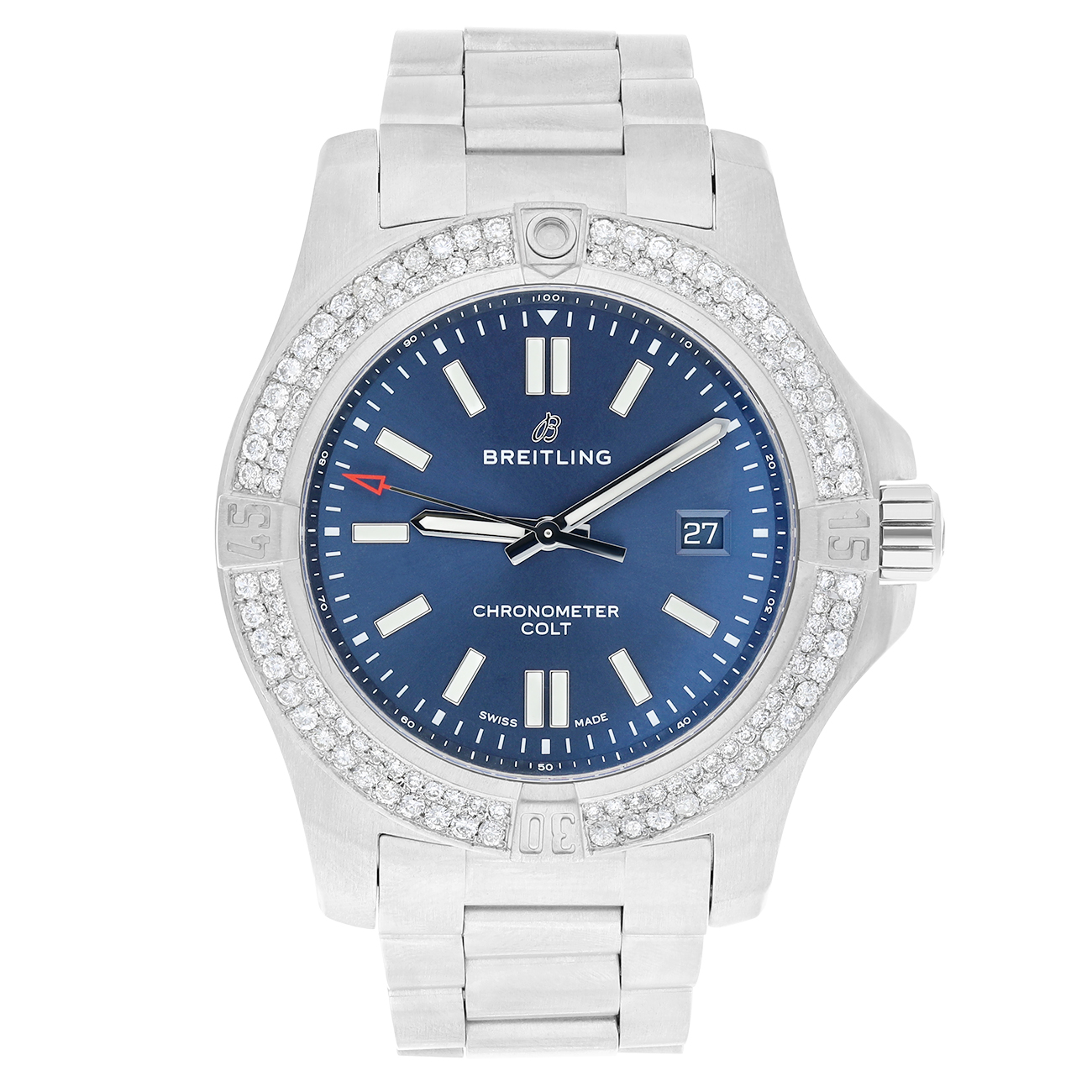 Breitling Chronomat Colt A17388101C1A1 features a 44mm stainless steel case with a striking blue dial and matching steel bracelet. It has a Custom diamond bezel, with diamonds that are not added by Breitling. Powered by an automatic movement, this versatile timepiece offers robust performance and classic style. Suitable for both men and unisex wear. In stock and ready to ship.