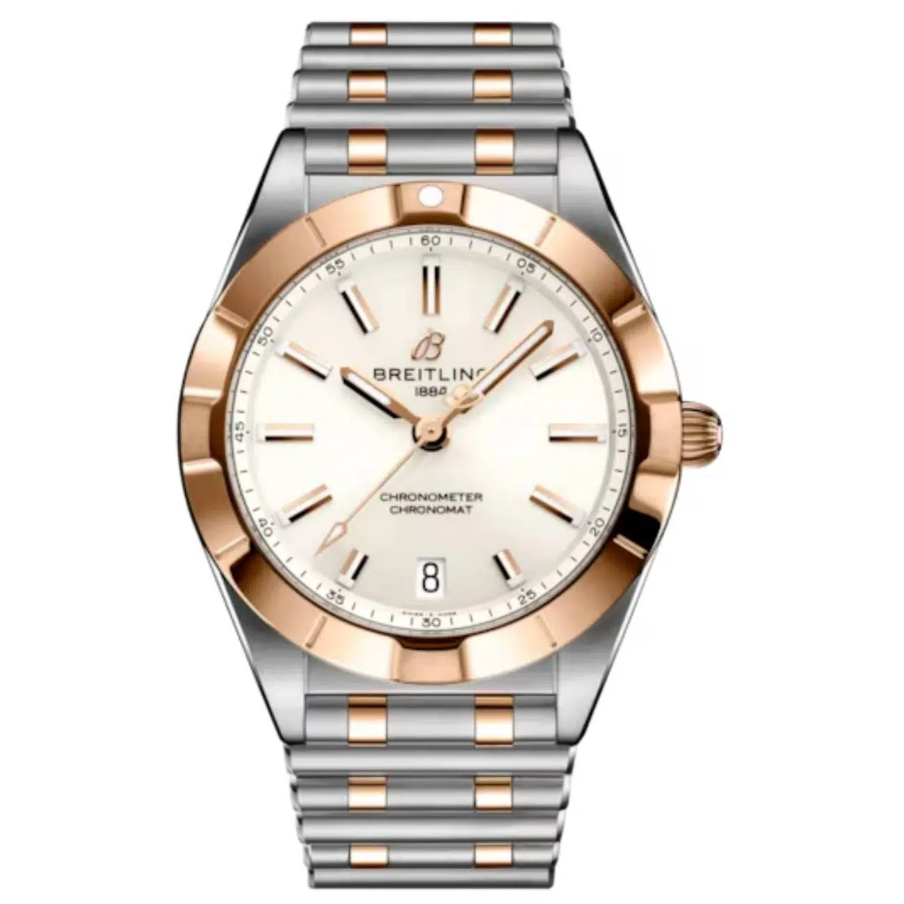 The Breitling Chronomat U77310101A1U1 is a refined 32mm ladies’ watch that combines elegance with precision performance. Crafted from stainless steel and 18k red gold, it features a fixed bezel and a cambered sapphire crystal glareproofed on both sides. Inside, it runs on the Breitling 77 SuperQuartz™ movement, which is ten times more accurate than standard quartz and includes an end-of-life (EOL) indicator.