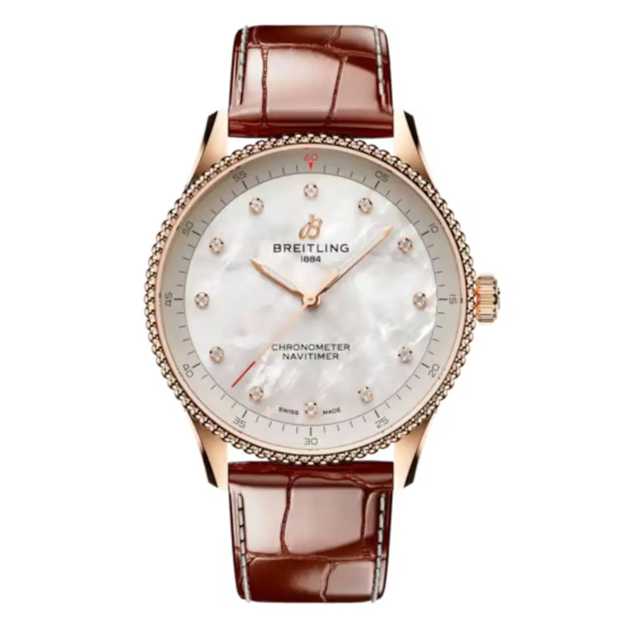 This model features a rich brown alligator leather strap with a matching 18K red gold tang-type buckle, ensuring a secure and luxurious fit. The fixed bezel, non-screw-locked crown with two gaskets, and light overall weight of just 42 grams add to the comfort and refinement. Designed for women who appreciate timeless style and reliable performance, the Navitimer Automatic is a modern classic in Breitling’s iconic aviation-inspired collection.