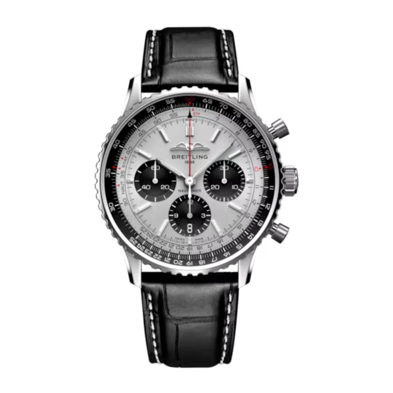 Crafted from stainless steel, the 43 mm case has a screwed-in sapphire crystal caseback and water resistance up to 3 bars. It comes paired with a black alligator leather strap and a stainless steel folding clasp, adding a refined touch to its classic pilot-watch aesthetics. With its blend of timeless style and technical mastery, this Navitimer remains a standout for collectors and aviation enthusiasts alike.
