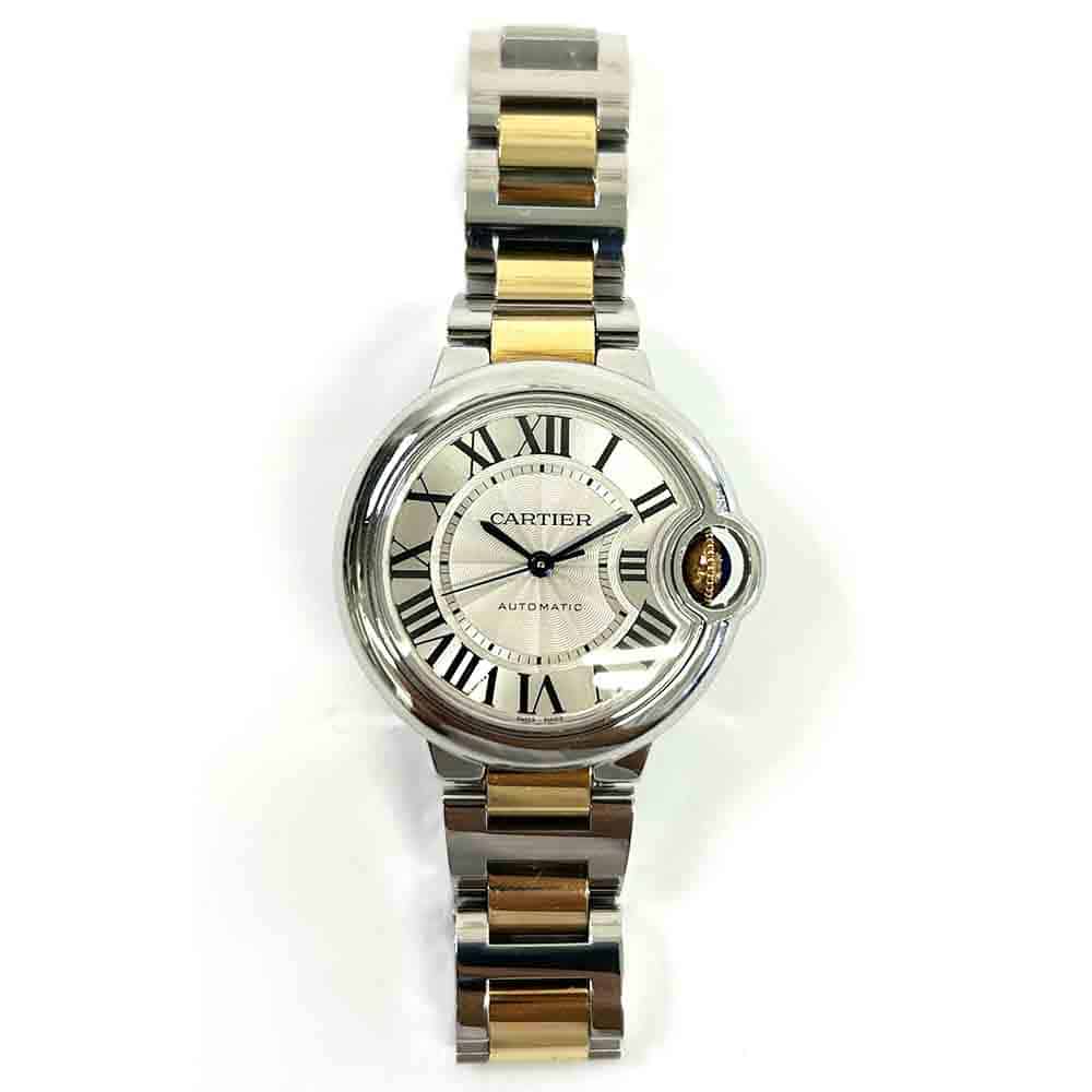 Cartier Ballon Bleu 33mm Women’s Watch Model W6920099. Stainless Steel case with Steel and Yellow Gold Polished watch band. Hidden Folding Clasp clasp. fixed bezel. Silver dial. Automatic Self Winding movement. Scratch Resistant Sapphire crystal. Case size: 33mm. Case thickness: 9.96mm. Solid case back. 30 Meters /100 feet water resistant.