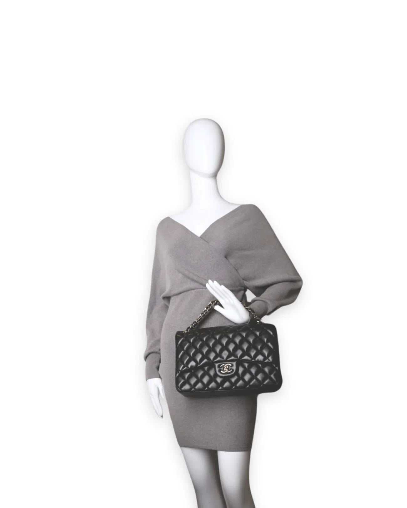 Timeless and iconic, this Chanel Jumbo Classic Flap is crafted from rich black lambskin leather with signature diamond quilting and gold-tone hardware. The oversized CC turn-lock closure and leather-woven chain strap enhance its luxurious appeal. Designed for both elegance and practicality, the spacious double-flap interior makes it a wardrobe staple.