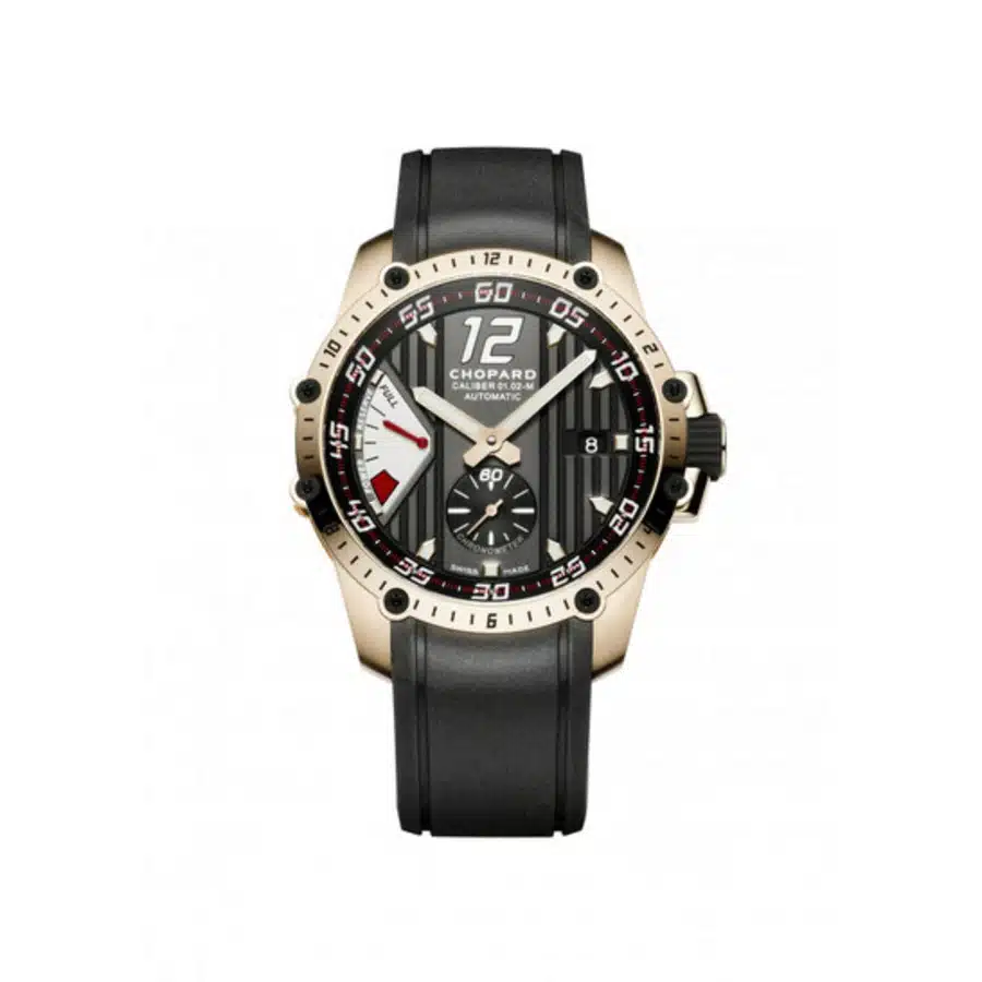 Chopard Calibre 01.02-M Automatic movement, containing 36 Jewels, bitting at 28800 vph, and has a power reserve of approximately 60 hours. Scratch resistant sapphire crystal. Transparent see through case back. Round case shape, case size: 45 mm, case thickness: 12.4 mm. 18kt rose gold fold over clasp. Water resistant at 100 meters / 330 feet. Functions: date, hour, minute, small second, power reserve indicator, chronometer. Superfast Power Control Series. Luxury watch style. Watch label: Swiss Made.