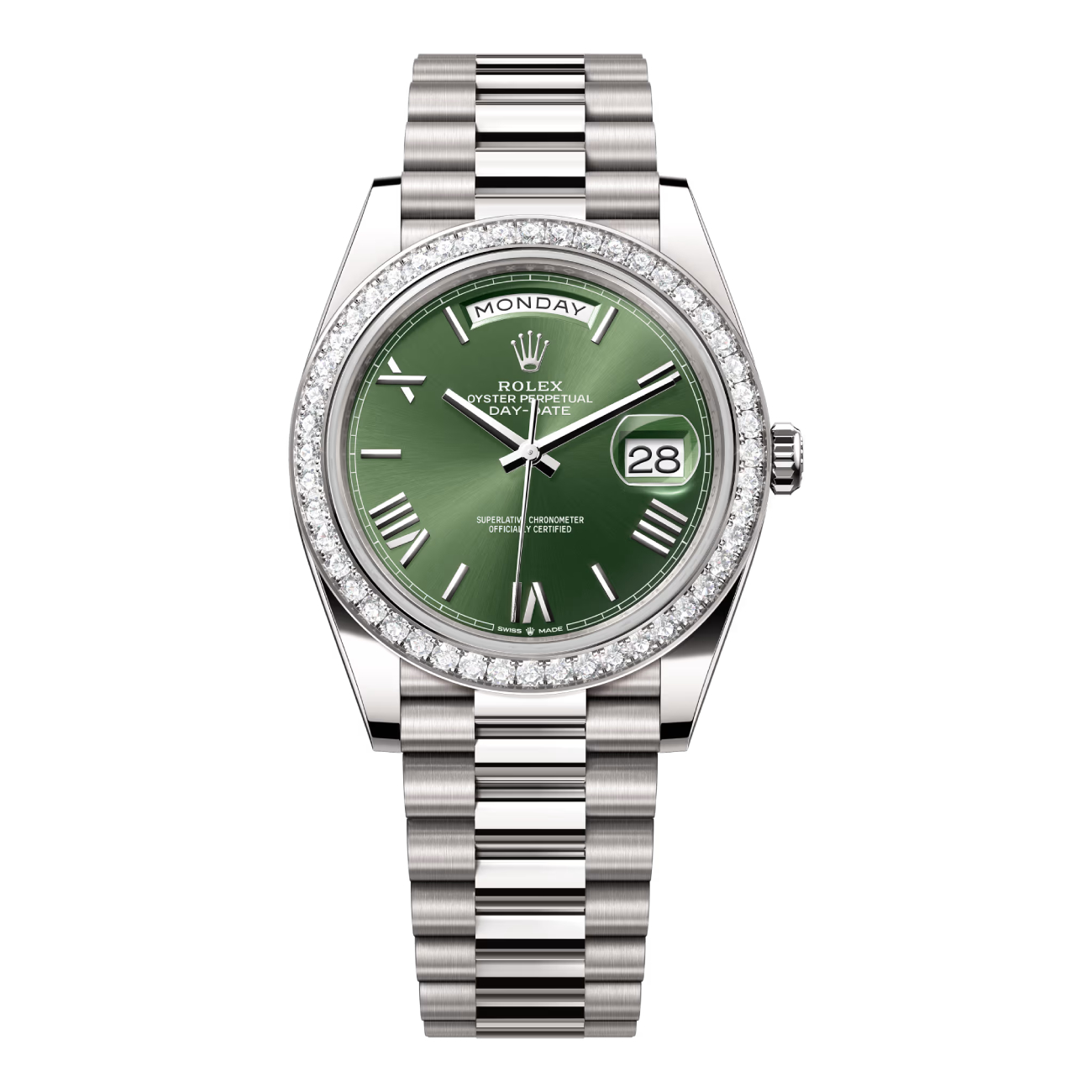 Every Day‑Date case and President bracelet produced in yellow, white or Everose is solid 18 k gold; only platinum versions use a different metal.
