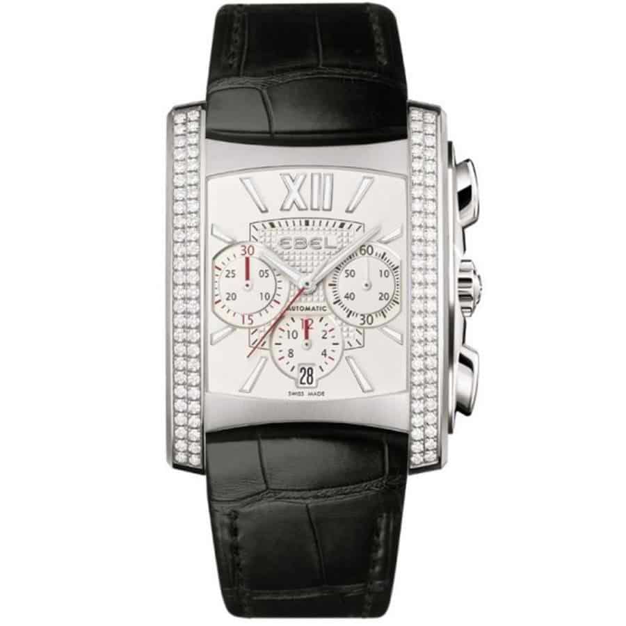 Stainless steel case with a black alligator leather strap. Fixed diamond set stainless steel bezel. White dial with silver-tone hands and index and Roman numeral hour markers. Roman numeral marks the 12 o’clock positon.. Dial Type: Analog. Luminescent hands and markers. Date display at the 6 o’clock position. Chronograph – three sub-dials displaying: 60 second, 30 minute and 12 hour. Automatic movement. Scratch resistant sapphire crystal. Case size: 36 mm. Case thickness: 13.4 mm. Rectangle case shape. Deployment with push button clasp. Water resistant at 50 meters / 165 feet. Functions: chronograph, date, hour, minute, second. Additional Info: total diamond weight: 1.66ct. Luxury watch style.