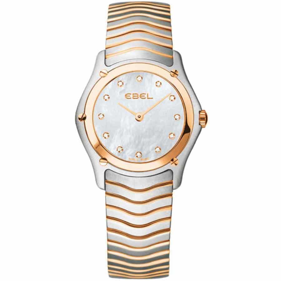 Brushed 18KT gold and stainless steel wave bracelet. Polished 18KT rose gold bezel. Mother-of-pearl dial with 12 diamond hour markers. Ebel Caliber 256 quartz movement.
