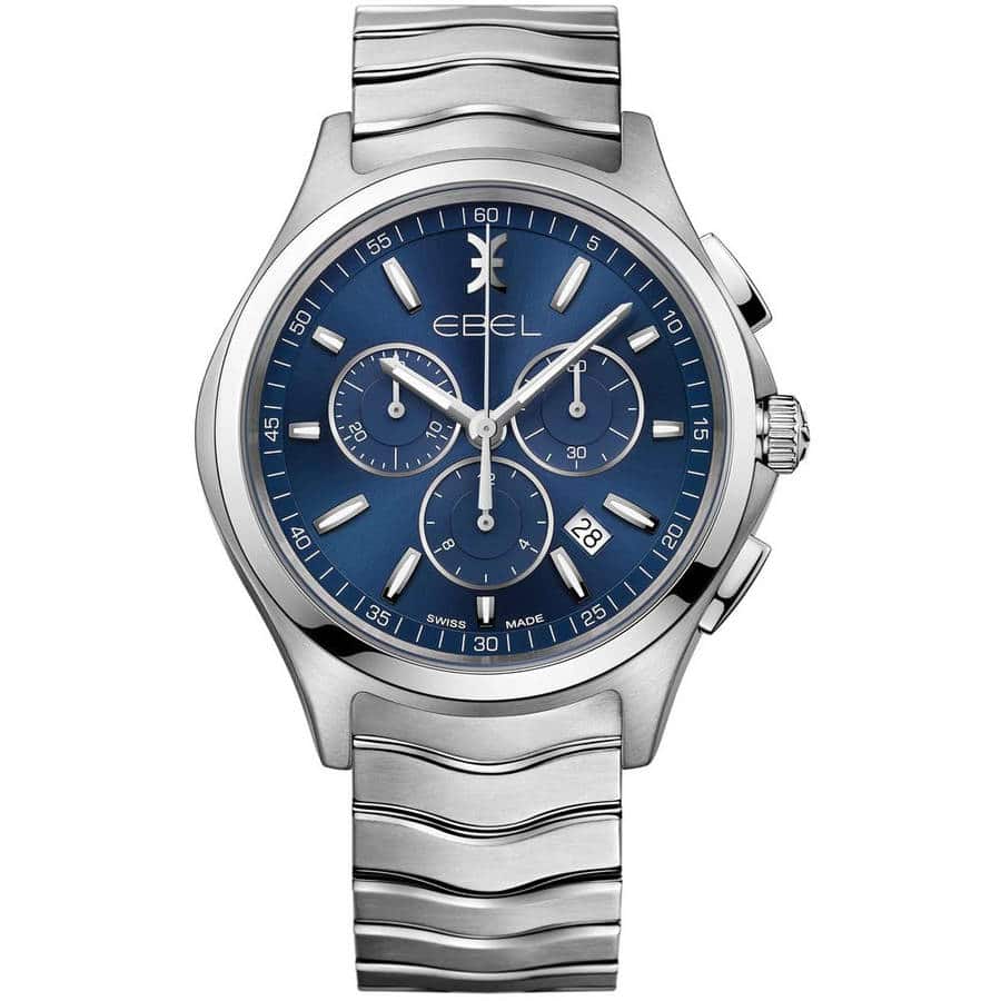 Silver-tone stainless steel case with a silver-tone stainless steel bracelet. Fixed silver-tone stainless steel bezel. Blue dial with silver-tone hands and index hour markers. Minute markers around the outer rim. Dial Type: Analog. Luminescent hands and markers. Date display between 4 and 5 o’clock position. Quartz movement. Scratch resistant sapphire crystal. Pull / push crown. Round case shape. Case size: 42 mm. Deployment with push button release clasp. Water resistant at 50 meters / 165 feet. Functions: chronograph, date, hour, minute, second. Sport watch style. Watch label: Swiss Made. Ebel Wave Chronograph Blue Dial Mens Watch 1216344.