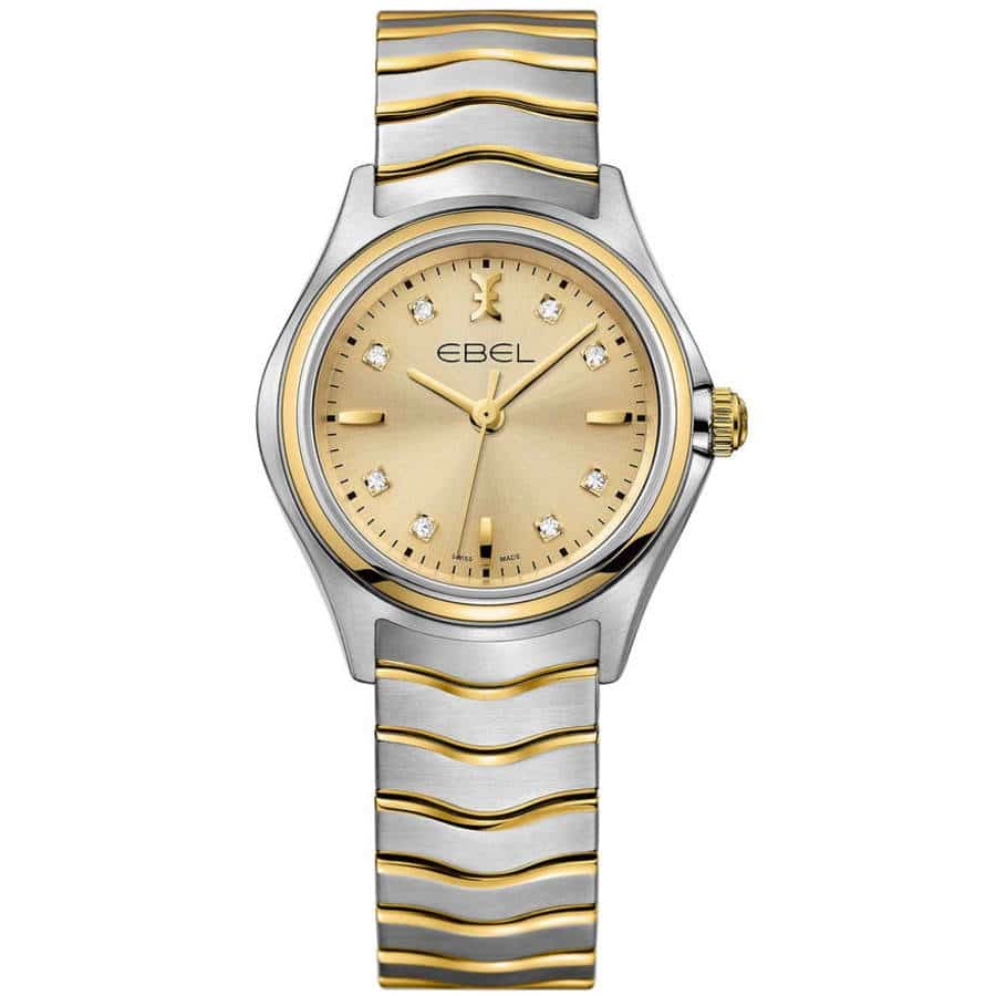 18 carat yellow gold and stainless steel case with a 18 carat yellow gold and stainless steel bracelet. Fixed bezel. Champagne galvanic dial with gold-tone hands and diamonds hour markers. Dial Type: Analog. Quartz movement. Scratch resistant sapphire crystal. Case size: 30 mm. Round case shape. Deployment with push button clasp. Water resistant at 50 meters / 165 feet. Functions: hour, minute, second. Luxury watch style. Watch label: Swiss Made. Ebel Wave Ladies Watch 1216317.