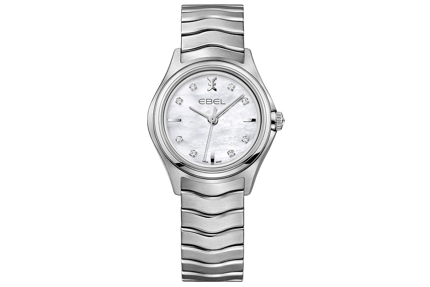 Stainless steel case with a stainless steel bracelet. Fixed stainless steel bezel. Mother of pearl dial with luminous hands and diamond hour markers. Dial Type: Analog. Quartz movement. Scratch resistant sapphire crystal. Solid case back. Case size: 30 mm. Case thickness: 8.5 mm. Round case shape. Band width: 15 mm. Deployment clasp. Water resistant at 50 meters / 165 feet. Functions: hour, minute, second. Luxury watch style. Watch label: Swiss Made. Ebel Wave Mother of Pearl Diamond Dial Ladies Watch 1216193.