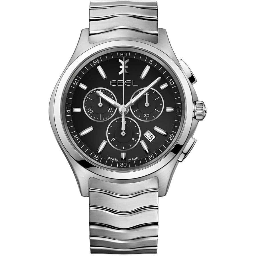 Silver-tone stainless steel case with a silver-tone stainless steel bracelet. Fixed silver-tone stainless steel bezel. Black dial with silver-tone hands and index hour markers. Minute markers around the outer rim. Dial Type: Analog. Luminescent hands and markers. Date display between 4 and 5 o’clock position. Quartz movement. Scratch resistant sapphire crystal. Pull / push crown. Round case shape. Case size: 42 mm. Deployment with push button release clasp. Water resistant at 50 meters / 165 feet. Functions: chronograph, date, hour, minute, second. Sport watch style. Watch label: Swiss Made. Ebel Wave Chronograph Black Dial Mens Watch 1216342.