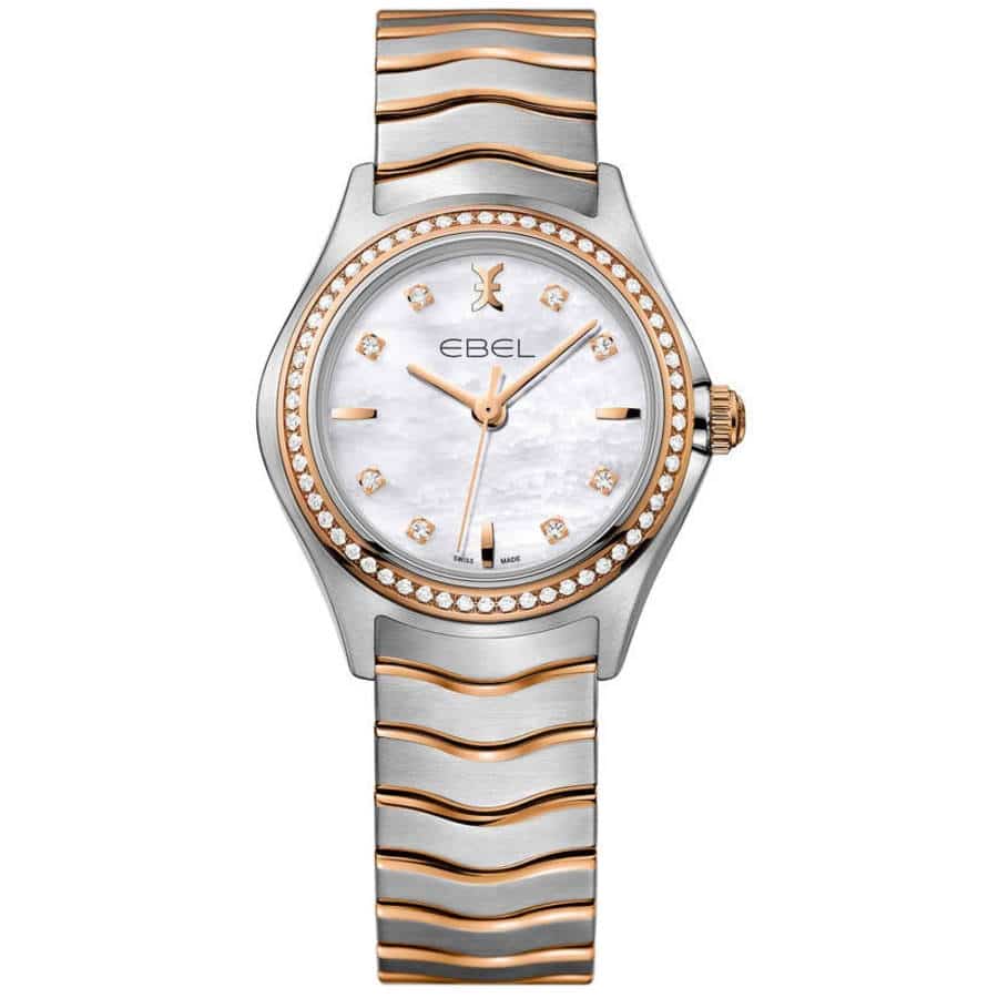 Stainless steel case with a two-tone stainless steel bracelet. Fixed- 18k rose gold bezel. White mother of pearl dial with rose gold-tone hands and diamonds hour markers. Dial Type: Analog. Swiss quartz movement. Scratch resistant sapphire crystal. Pull / push crown. Case size: 30 mm. Round case shape. Deployment with push button release clasp. Water resistant at 50 meters / 165 feet. Functions: hour, minute, second. Additional Info: bezel set with 58 diamonds (0.429 t.c.w.). Luxury watch style. Watch label: Swiss Made. Ebel Wave White Mother Of Pearl Ladies Two Tone Watch 1216325.