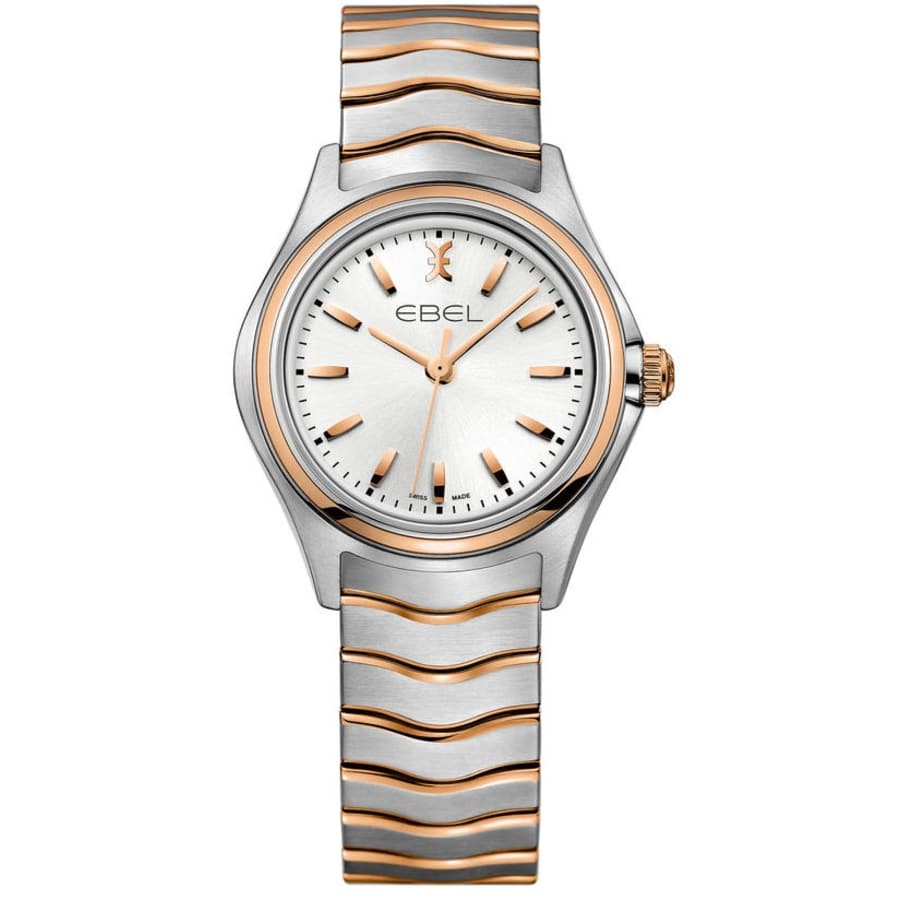 Ebel wave ladies watch 30mm. Silver-tone stainless steel case with a two-tone (silver-tone and gold-tone) stainless steel and 18kt rose gold bracelet. Fixed 18kt rose gold bezel. Silver-tone dial with gold-tone hands and index hour markers. Dial Type: Analog. Quartz movement. Scratch resistant sapphire crystal. Pull / push crown. Round case shape. Hidden folding clasp. Water resistant at 50 meters / 165 feet. Functions: hour, minute, second. Casual watch style. Watch label: Swiss Made. Ebel Wave Silver Dial Ladies Watch 1216323.