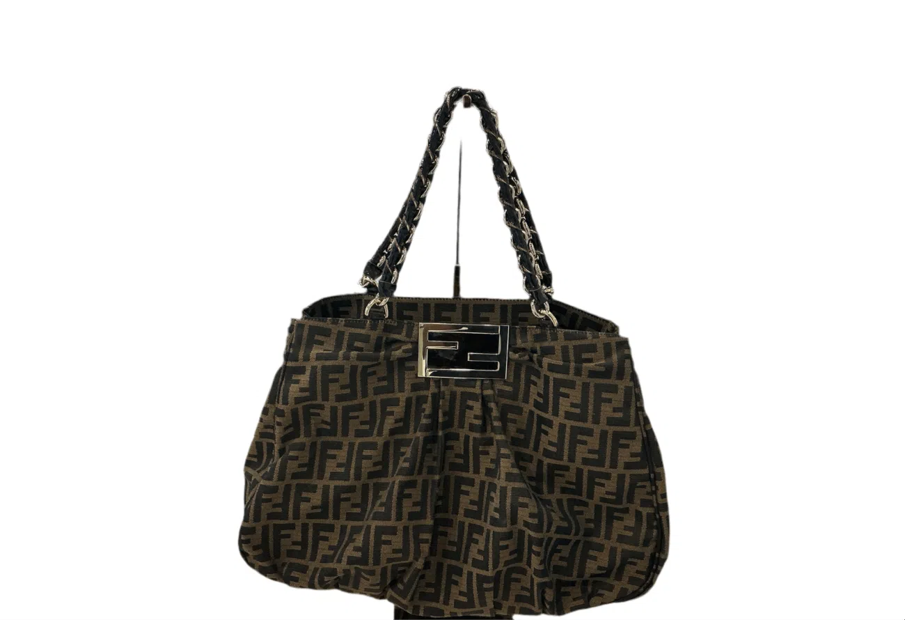 This is an authentic FENDI Zucca Large Mia Tote in Tobacco. This stylish tote is crafted of traditional Fendi FF Zucca tonal brown canvas. The bag features brown rolled leather top handles as well as a gold and black Fendi FF logo buckle. The top is open to a partitioned brown fabric interior with a central zipped compartment and patch pockets.