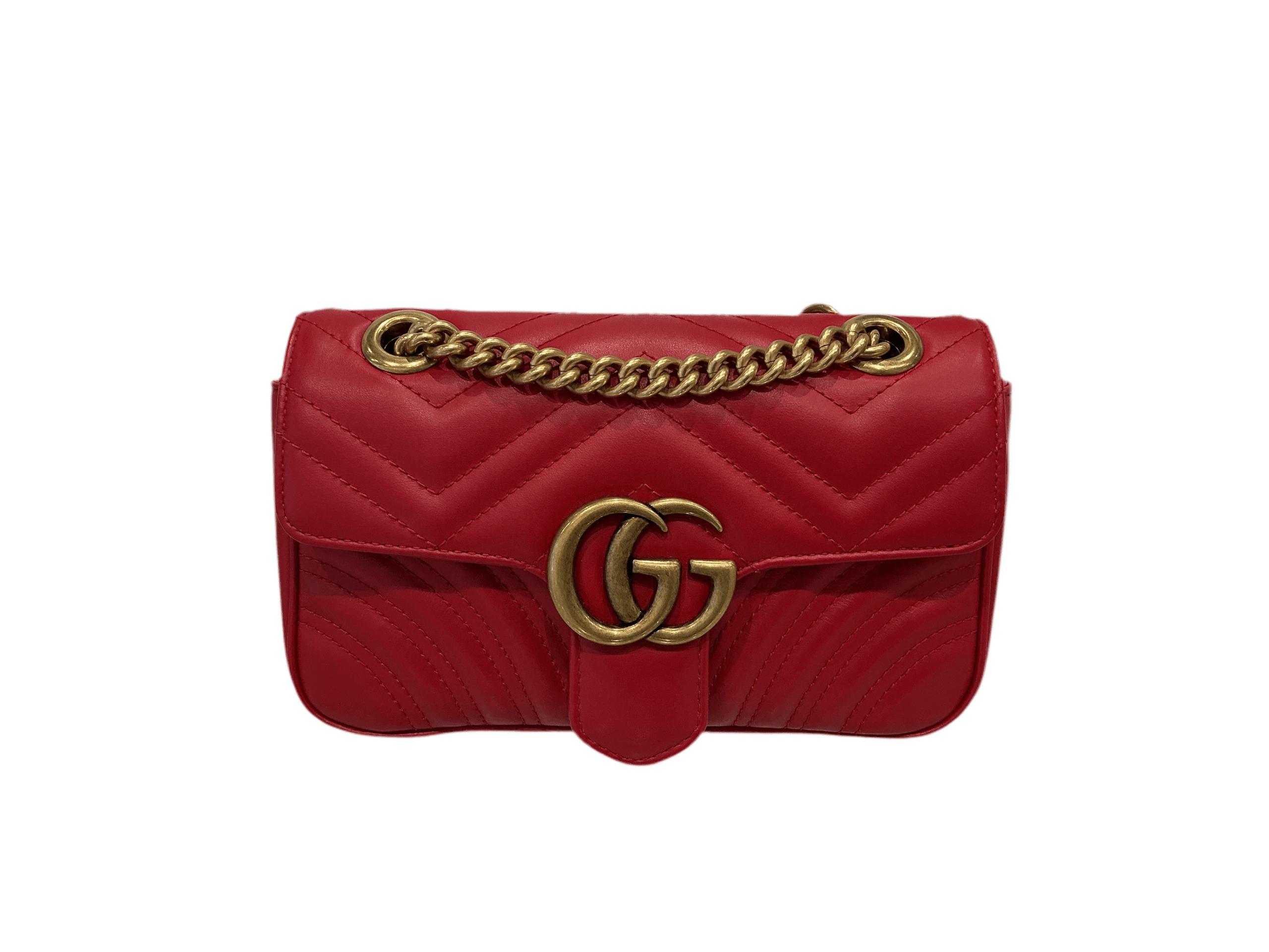 This is an authentic GUCCI Calfskin Matelasse Small GG Marmont Shoulder Bag in Hibiscus Red. This shoulder bag is crafted of smooth and supple quilted calfskin leather in red. This bag features an aged gold chain and a leather shoulder strap. The front flap has a double GG logo and opens to a beige microfiber interior with a zipper pocket.