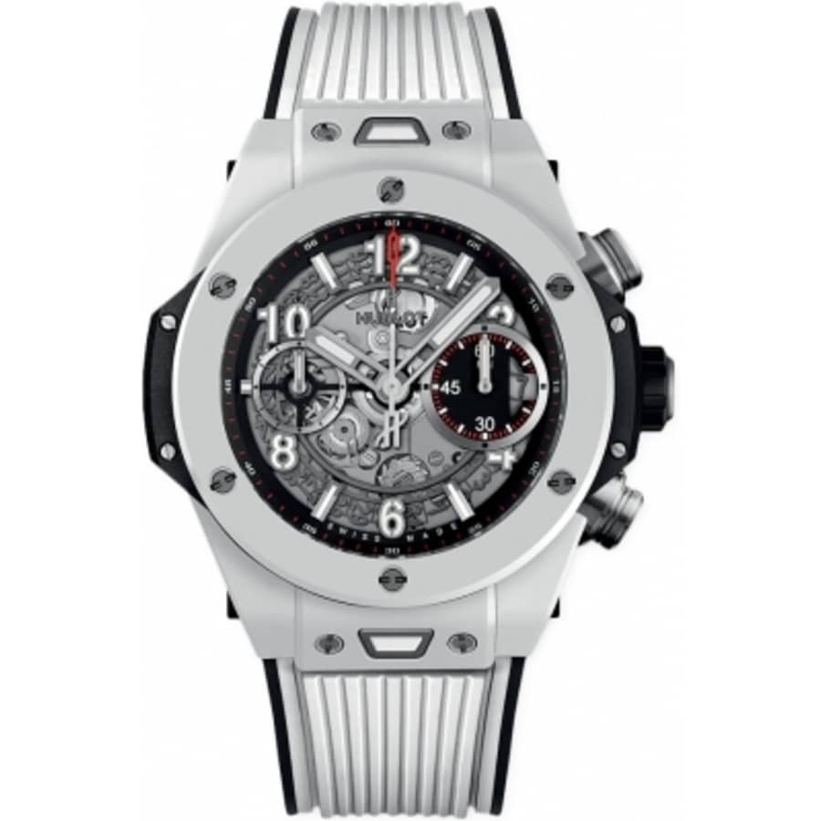 White ceramic case with a white (structured lined) rubber strap. Fixed white ceramic bezel. Black composite resin bezel lug and case band. Silver skeleton dial with luminous silver-tone hands and alternating Arabic numeral and index hour markers. Arabic numeral minute markers (at 5 minute intervals). Minute markers around the outer rim. Dial Type: Analog. Luminescent hands and markers. Date display at the 3 o’clock position. Chronograph – two sub-dials displaying: 60 second and 60 minute. Hublot calibre HUB1280 automatic movement, containing 43 Jewels, composed of 354 parts, bitting at 28800 vph, and has a power reserve of approximately 72 hours. Scratch resistant sapphire crystal. Screw down crown. Transparent case back. Round case shape. Case size: 42 mm. Case thickness: 14.5 mm. Fold over clasp with a push button release. Water resistant at 100 meters / 330 feet. Functions: chronograph, date, hour, minute, second. Big Bang Unico Series. Luxury watch style. Watch label: Swiss Made. Hublot Big Bang UNICO Automatic Chronograph White Ceramic Silver Dial Men’s Watch 441.HX.1170.RX.