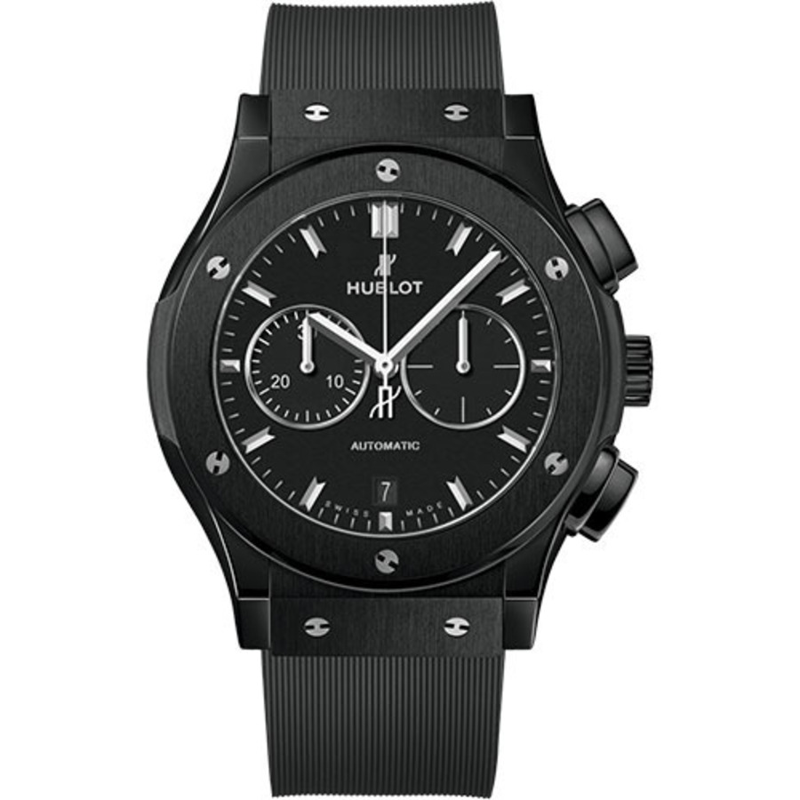 Black satin-finished and polished ceramic case with a black lined rubber strap. Fixed black satin-finished and polished ceramic bezel. Black dial with silver-tone hands and index hour markers. Minute markers around the outer rim. Dial Type: Analog. Date display at the 6 o’clock position. Chronograph – two sub-dials displaying: 60 second and 30 minute. Hublot Calibre HUB1153 Automatic movement, containing 35 Jewels, composed of 155 parts, bitting at 28800 vph, and has a power reserve of approximately 42 hours. Scratch resistant sapphire crystal. Transparent case back. Round case shape, case size: 42 mm. Deployment clasp. Water resistant at 50 meters / 165 feet. Functions: chronograph, date, hour, minute, second. Classic Fusion Series.