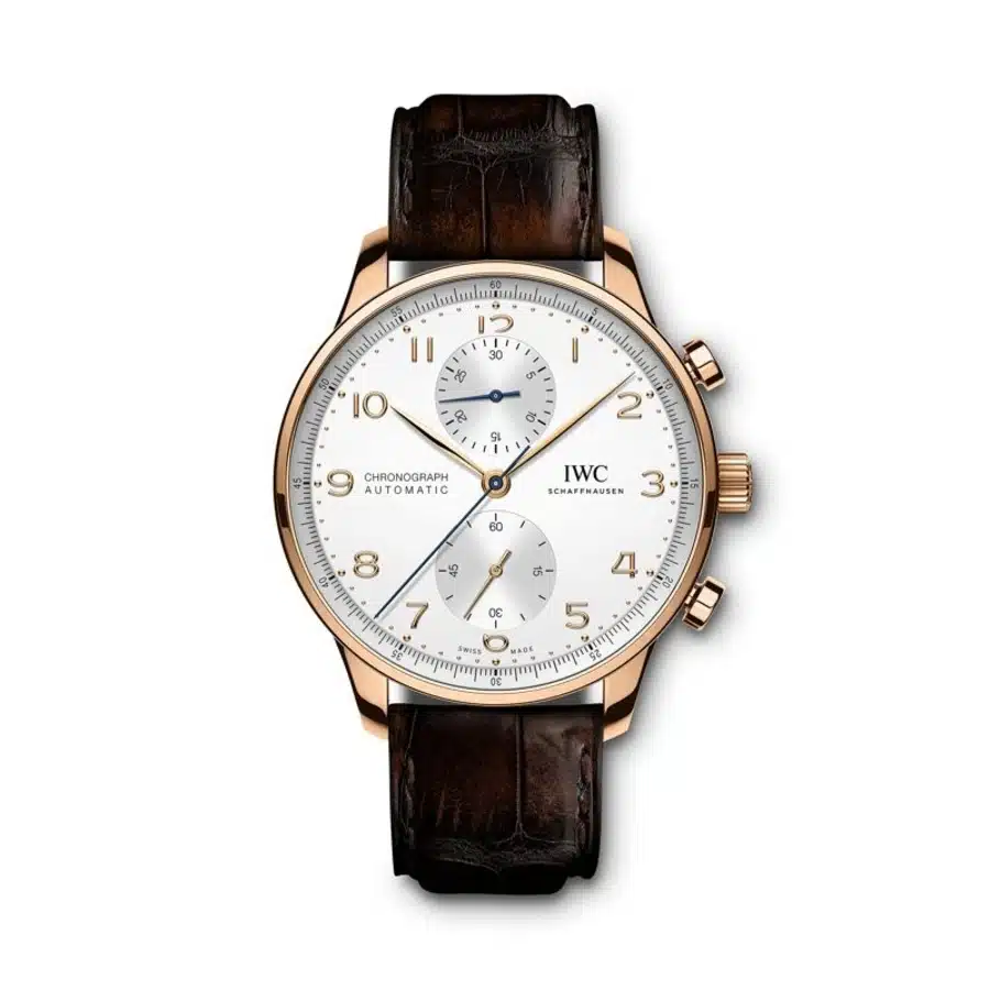 18kt rose gold case with a brown (alligator) leather strap. Fixed 18kt rose gold bezel. Silver dial with rose gold-tone leaf-style shape hands and Arabic numeral hour markers. Minute markers around the outer rim. Dial Type: Analog. Chronograph – two sub-dials displaying: 60 second and 30 minute. IWC calibre 69355 automatic movement, based upon IWC 69370, containing 27 Jewels, composed of 194 parts, bitting at 28800 vph, and has a power reserve of approximately 46 hours. Scratch resistant sapphire crystal. Pull / push crown. Transparent case back. Round case shape. Case size: 41 mm. Case thickness: 13.1 mm. Band width: 20 mm. Tang clasp. Water resistant at 30 meters / 100 feet. Functions: chronograph, column wheel, hour, minute, small second. Portugieser Series. Luxury watch style.