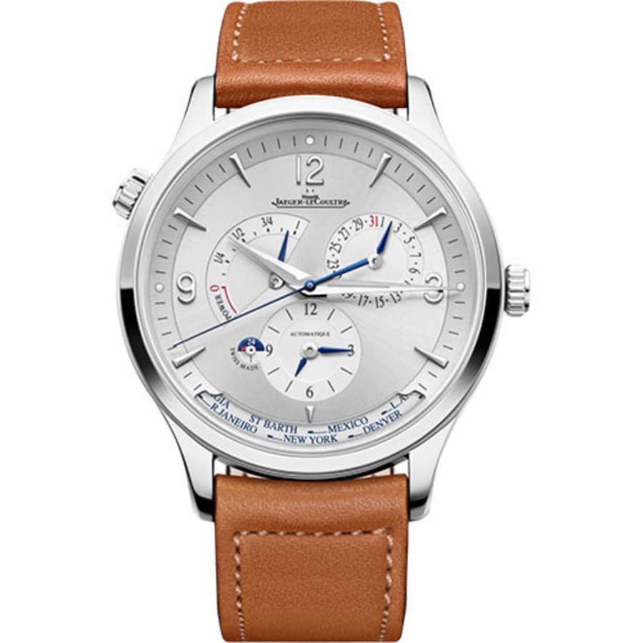 Stainless steel case with a brown leather strap. Fixed stainless steel bezel. Silver dial with luminous silver-tone hands and index hour markers. Arabic numerals appear at the 3, 9 and 12 o’clock positions. Minute markers around the outer rim. Dial Type: Analog. Luminescent hands and markers. World time cities display. Three displays showing: 12 hours, date and power reserve. Jaeger LeCoultre Calibre 939AA automatic movement. Scratch resistant sapphire crystal.