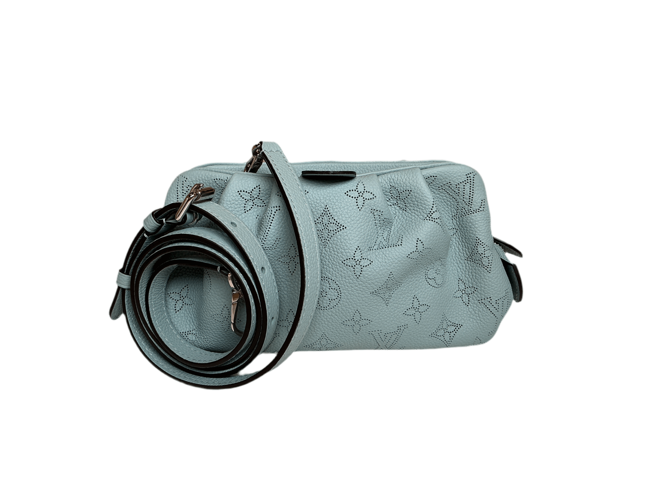 This is an authentic LOUIS VUITTON Mahina Scala Mini Pouch in Vert Lagon. This stylish pochette is crafted of soft Louis Vuitton monogram perforated leather in light blue. The bag features an adjustable leather shoulder strap with silver hardware. The top zipper opens to a a matching fabric interior with a patch pocket.