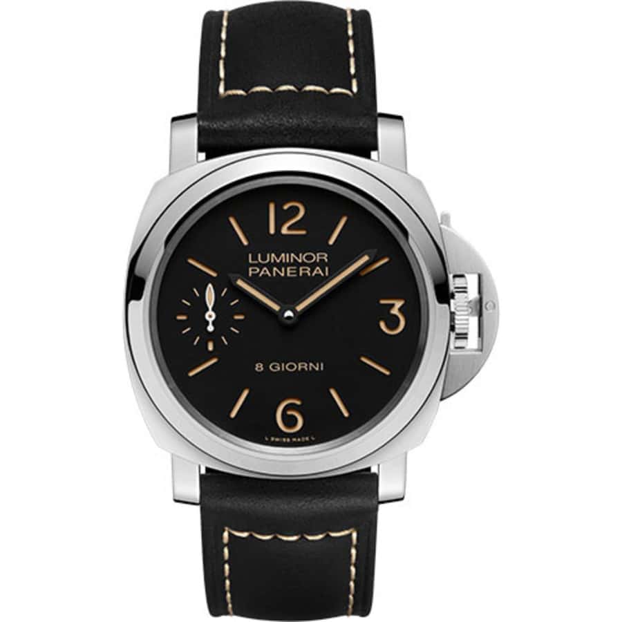 44mm AISI 316L polished steel case, sapphire crystal back, polished steel bezel, black dial with luminous arabic numerals and hour markers, small seconds at 9 o’clock, P.5000 calibre handwound movement with hours, minutes, small seconds, approximately 8 days of power reserve, black calf ponte vecchio strap with beige stitching. Water resistant to 30 bar (~300 metres).