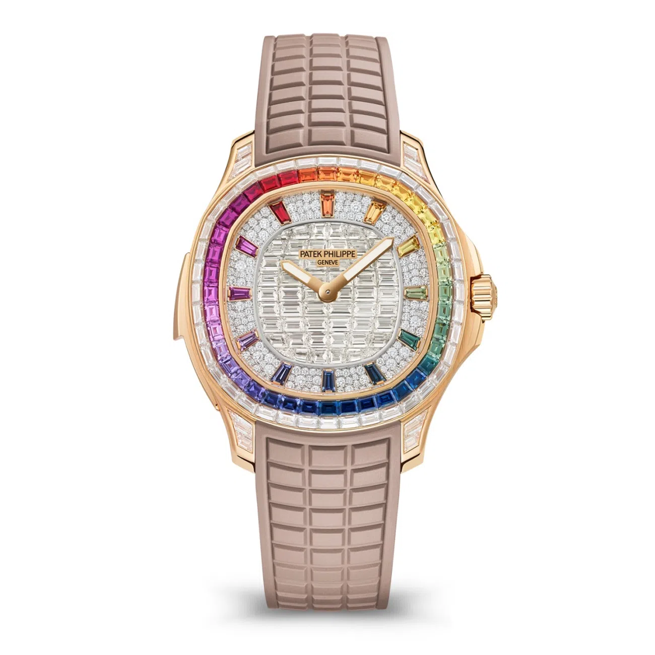 The Patek Philippe Aquanaut Luce Ref. 5260/355R is a stunning self-winding minute repeater watch, featuring a rose gold case adorned with 52 multicolored sapphires (3.19 cts), 112 baguette diamonds (7.31 cts), and 160 brilliant-cut diamonds (0.72 ct).