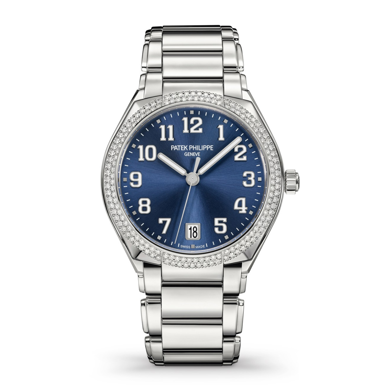 Polished stainless steel case. Bezel set with 160 diamonds weighing a total of +/- 0.77 carats. Blue dial with a fine sunburst finish.