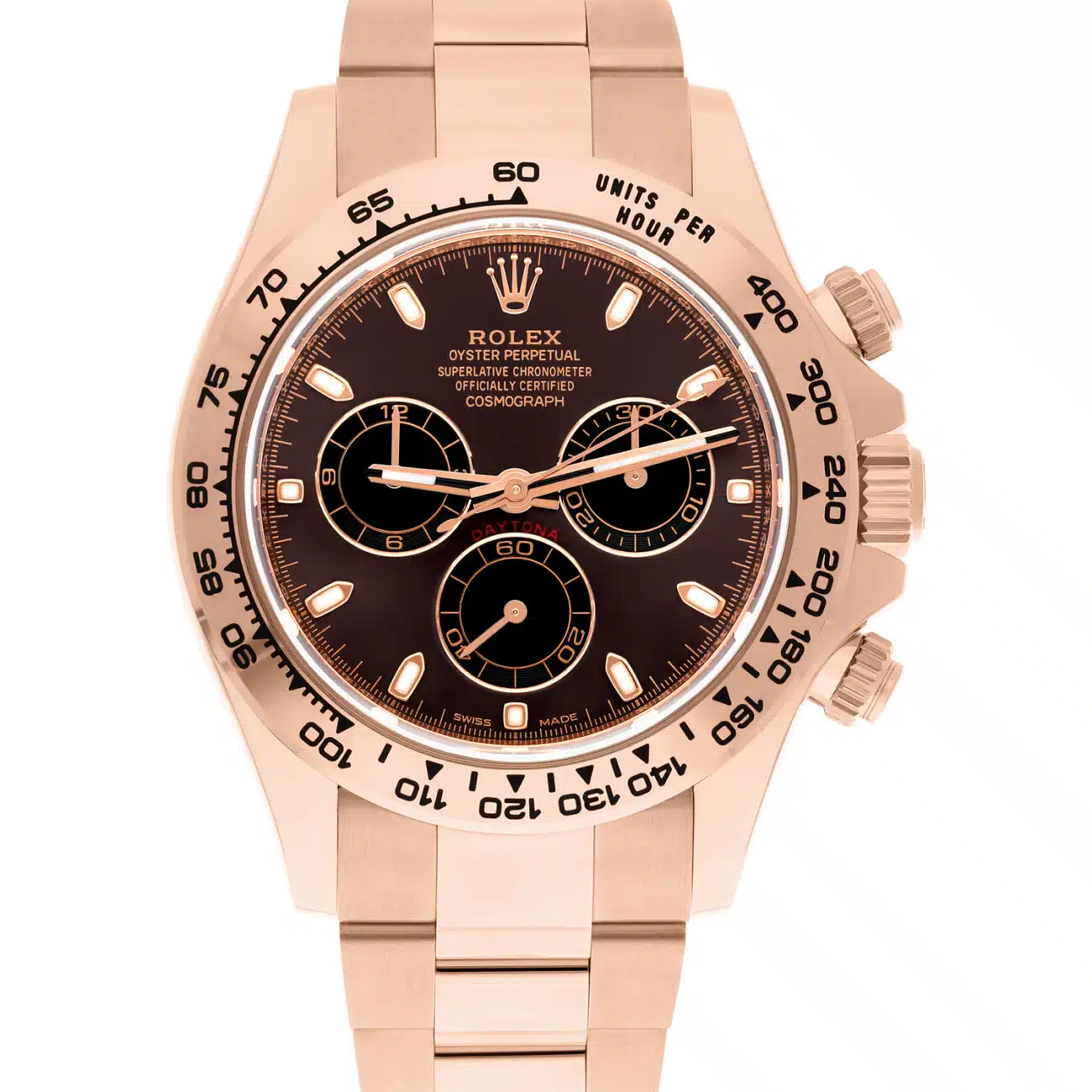 Complete with its original Rolex box, booklets, swing tags and warranty card. Under Rolex warranty until April 2027. This 116505 Daytona looks absolutely magnificent in 18ct Everose gold with discontinued chocolate brown dial, one of the most beautiful Daytonas ever made. The watch is truly unworn.