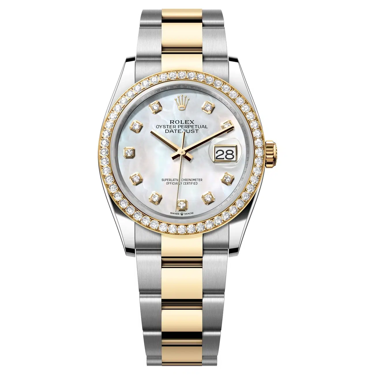 Timeless Rolex elegance with a touch of sparkle. The Datejust 36 ref. 126283RBR-0010 pairs Oystersteel and 18 ct yellow gold with a Rolex diamond-set bezel, framing a Mother of Pearl dial with diamond‑set markers.