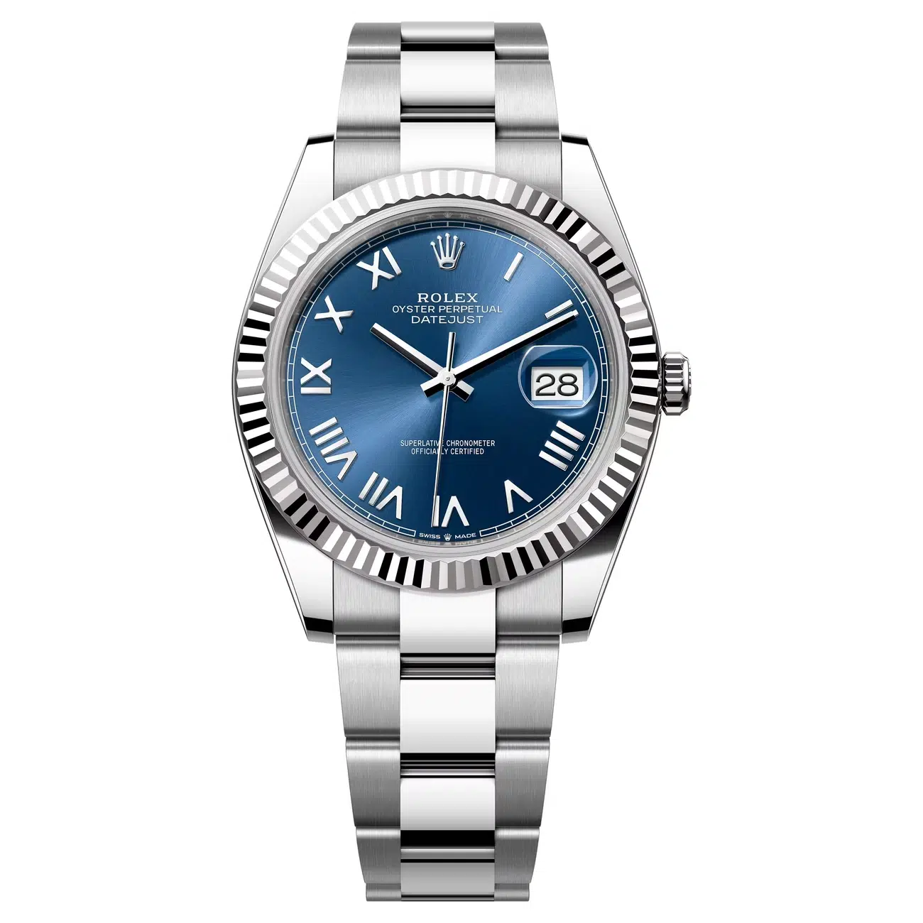 The Rolex 126334-0037 Datejust 41mm Stainless Steel Case comprised of a 904L steel monobloc middle case. Screw-down steel back. Screw-down crown with twinlock double waterproof system. 18K white gold fluted bezel. Scratch-resistant double anti-reflective sapphire crystal with cyclops lens over the date. Blue dial, with Silver-tone hands and Silver-tone roman numeral hour markers.