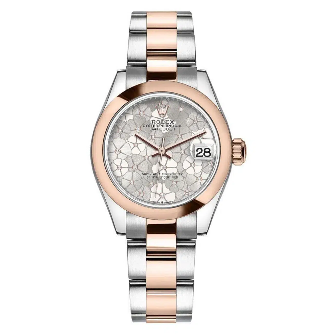 31mm Everose Rolesor case comprised of Oystersteel and Everose gold, screw-down back, screw-down crown with twinlock double waterproofness system, domed bezel, scratch-resistant sapphire crystal with cyclops lens over the date, silver floral motif dial set with 24 diamonds.