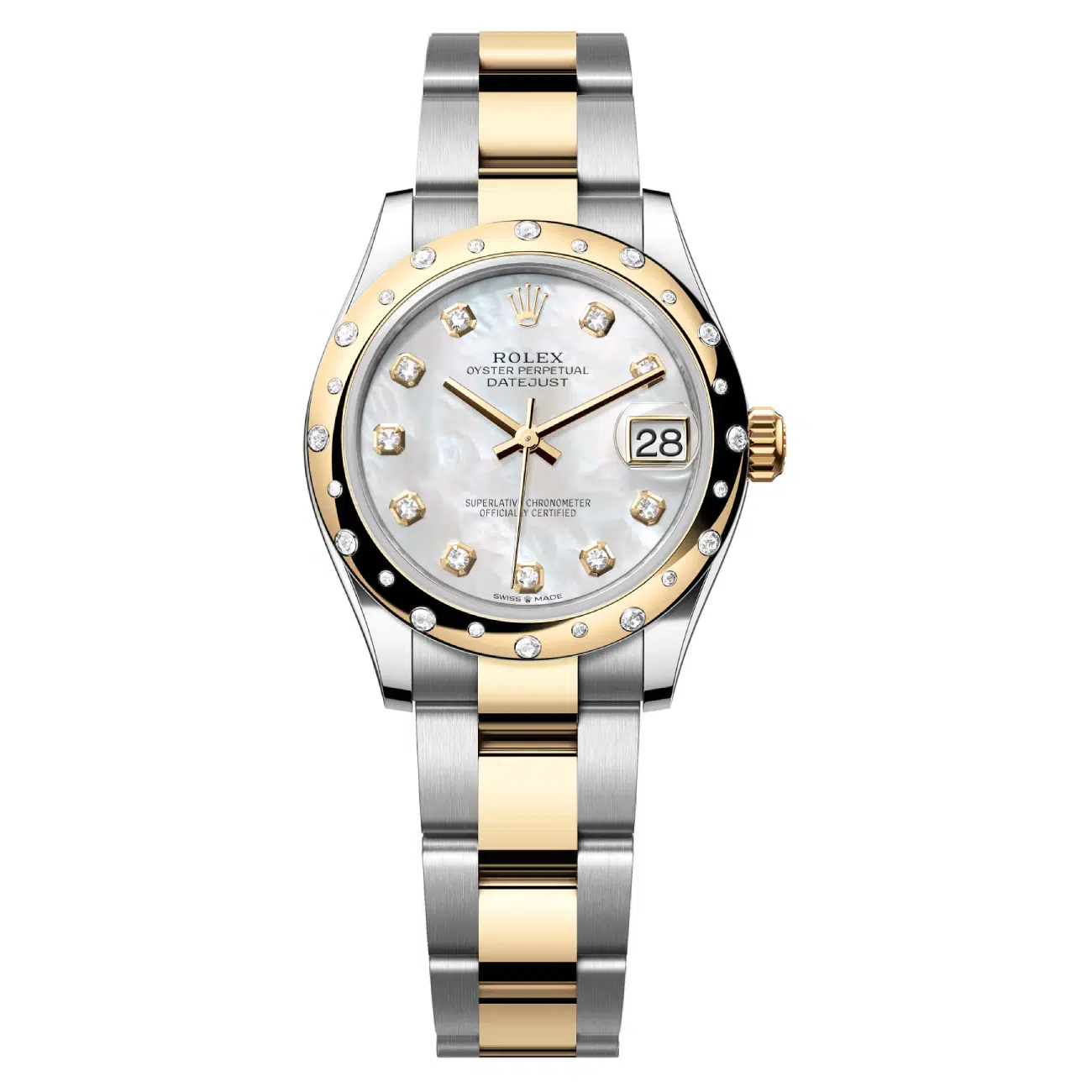 31mm yellow Rolesor case comprised of Oystersteel and 18K yellow gold, screw-down back, screw-down crown with twinlock double waterproofness system, 18K yellow gold domed bezel set with diamonds, scratch-resistant sapphire crystal with cyclops lens over the date, mother-of-pearl dial, diamond hour markers.