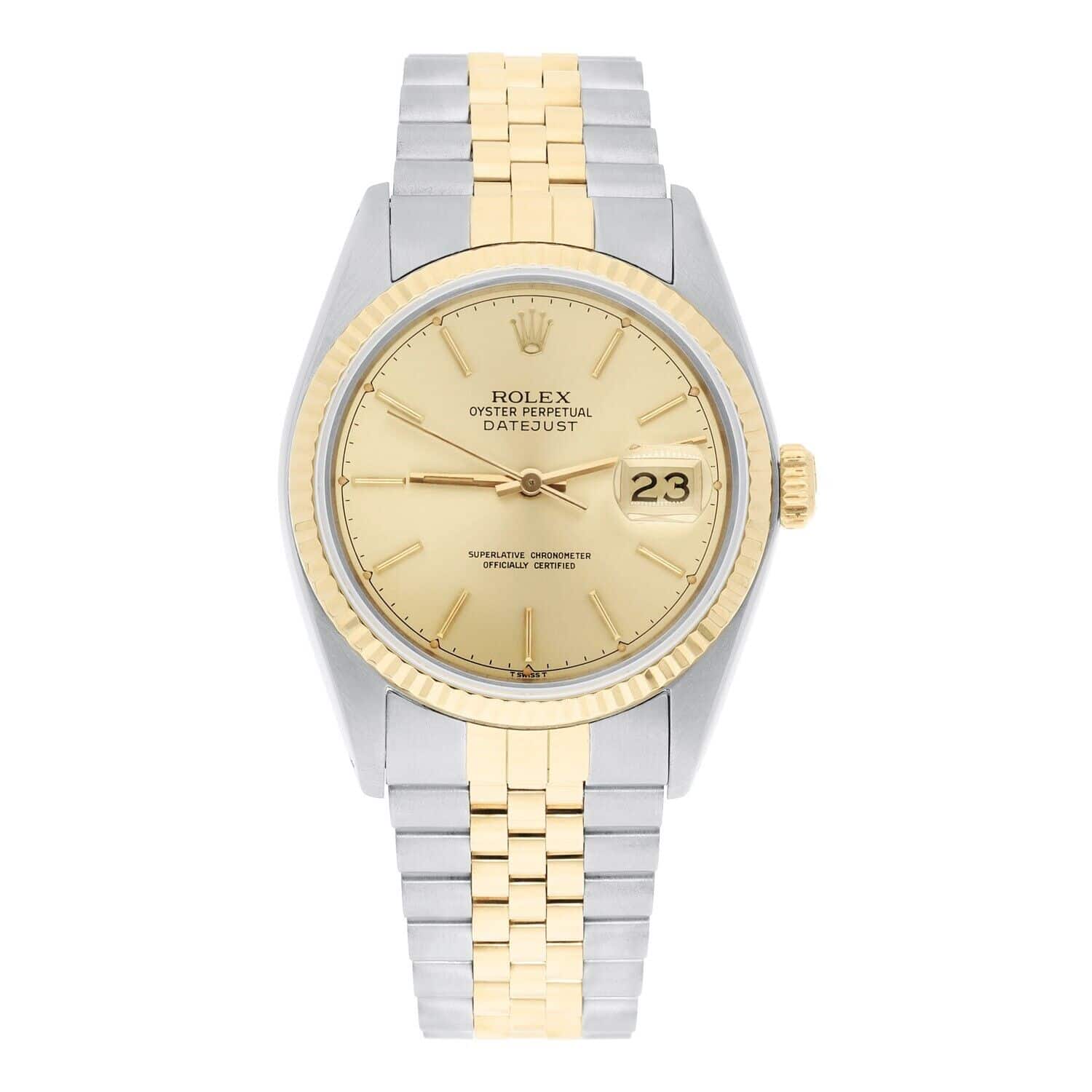 Silver-tone stainless steel case with a two-tone (silver-tone and gold-tone) stainless steel jubilee bracelet. Fixed fluted gold-tone 18kt yellow gold bezel. Champagne dial with gold-tone hands and index hour markers. Minute markers around the outer rim. Dial Type: Analog. Luminescent hands and markers. Date display at the 3 o’clock position. Rolex Calibre 3035 Automatic movement, containing 27 Jewels, bitting at 28800 vph, and has a power reserve of approximately 50 hours. Scratch resistant sapphire crystal. Screw down crown. Solid case back. Round case shape, case size: 36 mm, case thickness: 13 mm. Band length: 7 1/2 inches. Fold over clasp. Water resistant at 100 meters / 330 feet. Functions: date, hour, minute, second, chronometer. Datejust Series. Luxury watch style.