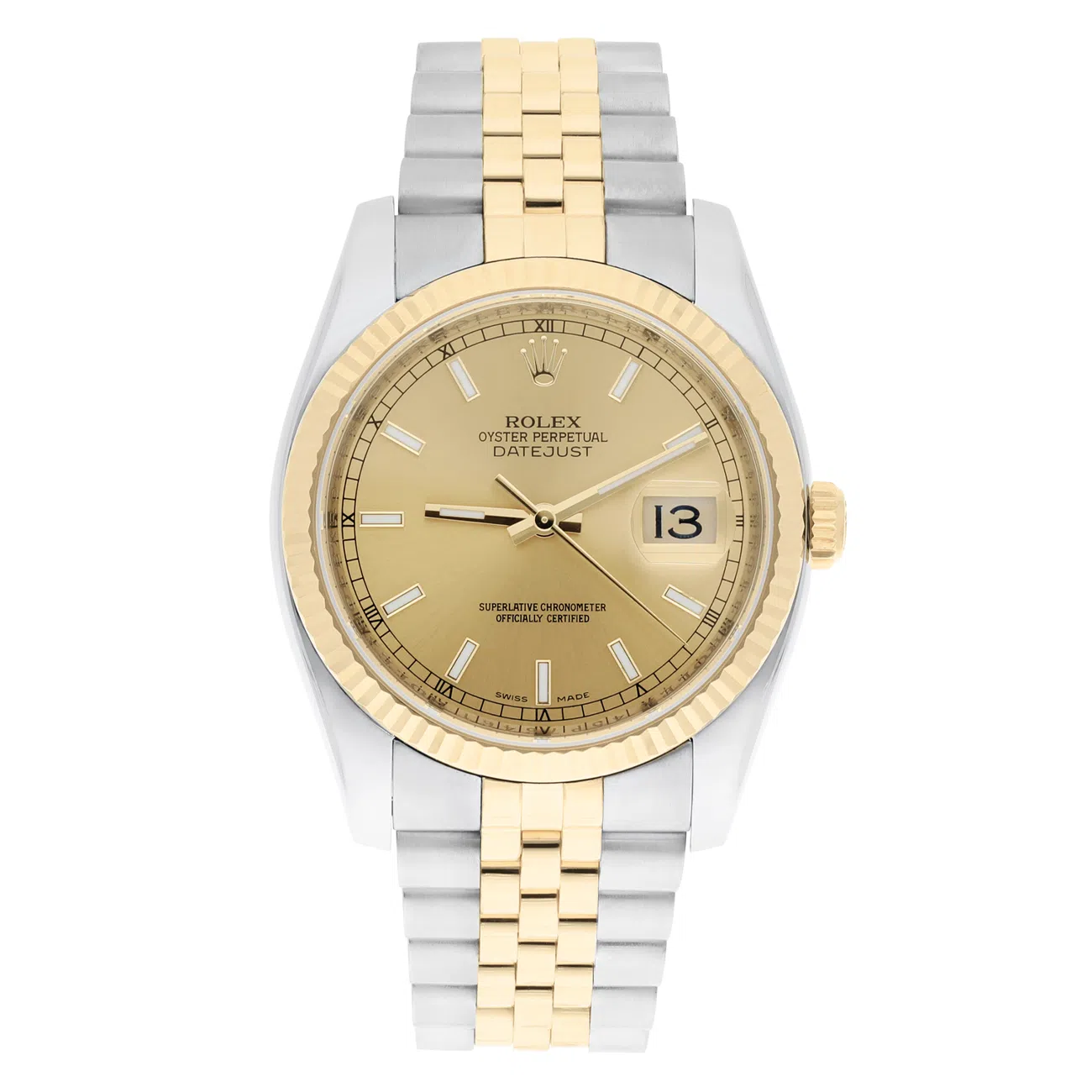 This 36mm Rolex Datejust is crafted from stainless steel and 18k yellow gold, featuring a classic Jubilee bracelet and a solid yellow gold bezel. The champagne dial displays gold-tone hands and a mix of index and Roman numeral hour markers, with a date window at 3 o’clock.