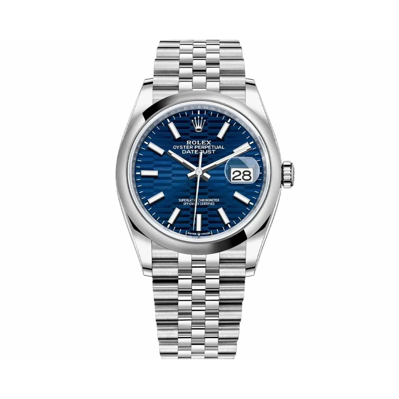 36mm Oystersteel case, screw-down steel back, screw-down crown with twinlock double waterproofness system, domed bezel, scratch-resistant sapphire crystal with cyclops lens over the date, blue fluted motif dial, index hour markers.