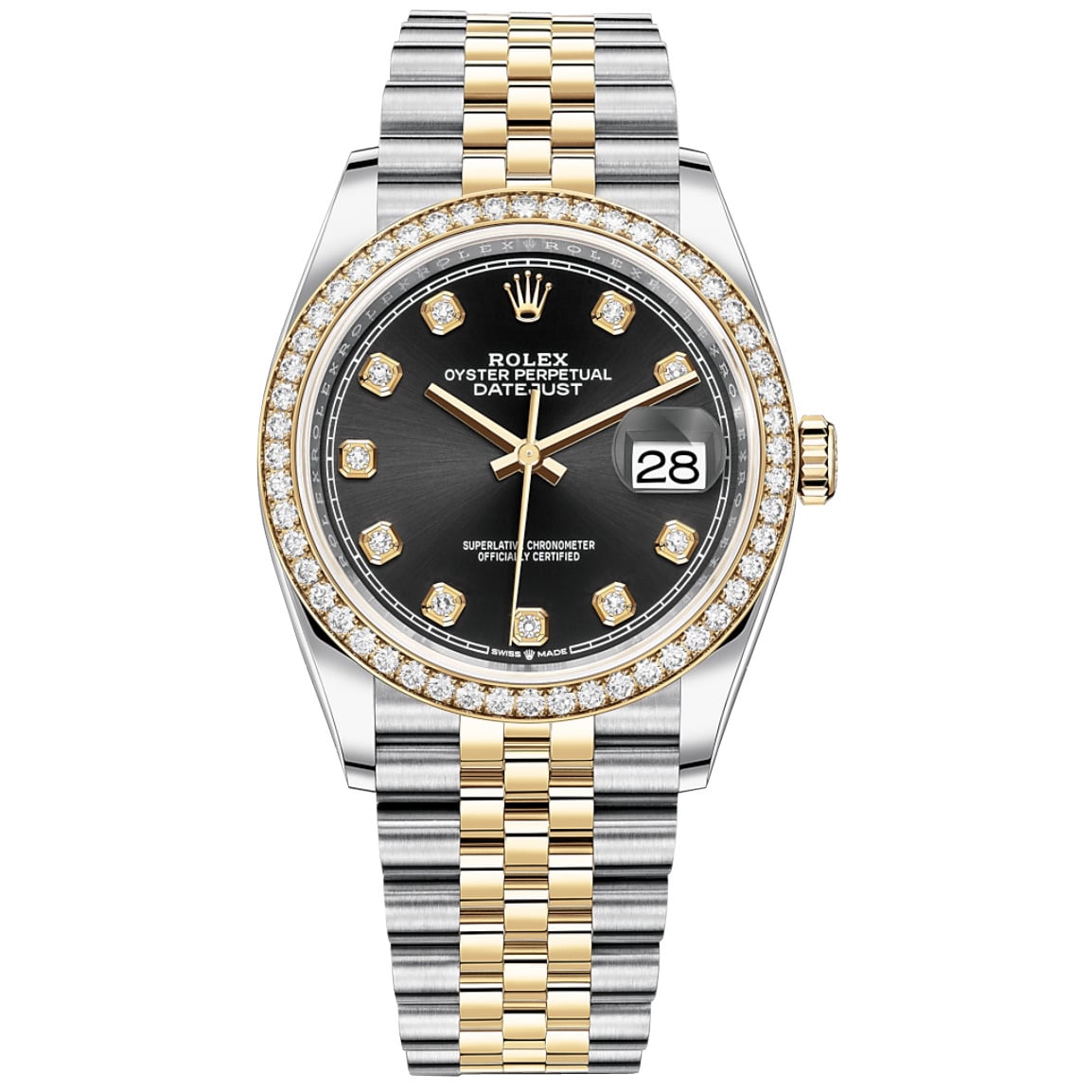 The Rolex Oyster Perpetual Datejust 126283rbr-0007 36mm in Oystersteel and yellow gold features a champagne color. Yellow gold-tone bezel set with diamonds. Black dial with Yellow gold-tone hands and yellow gold-tone hour markers set with 10 diamonds and crown logo at 12 o’clock. Date display at 3 o’clock position. Scratch-resistant sapphire; Cyclops lens over the date.