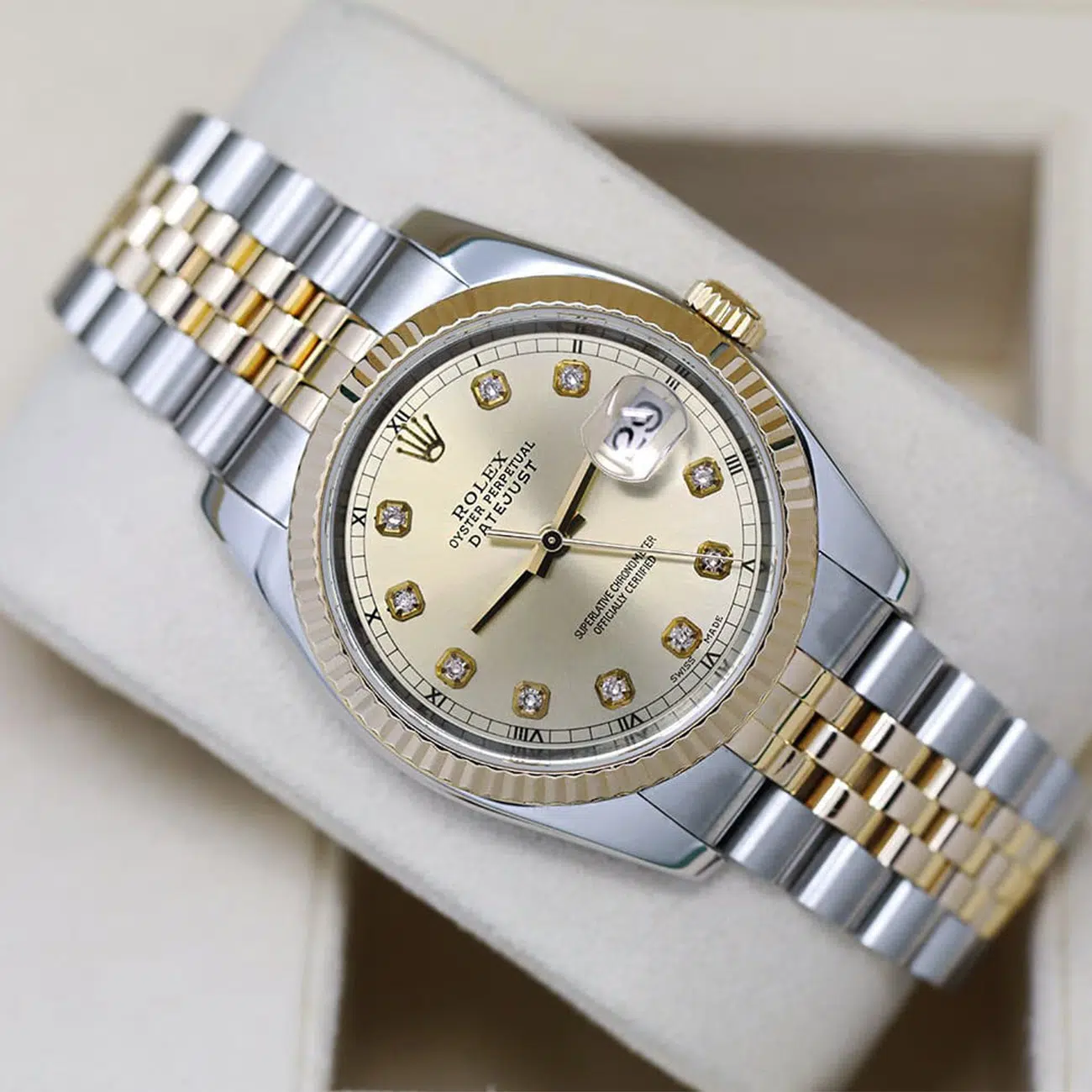 This Rolex Datejust 36mm features a stainless steel and 18k yellow gold case, paired with a Jubilee bracelet. The champagne dial is adorned with diamond hour markers and gold-tone hands.