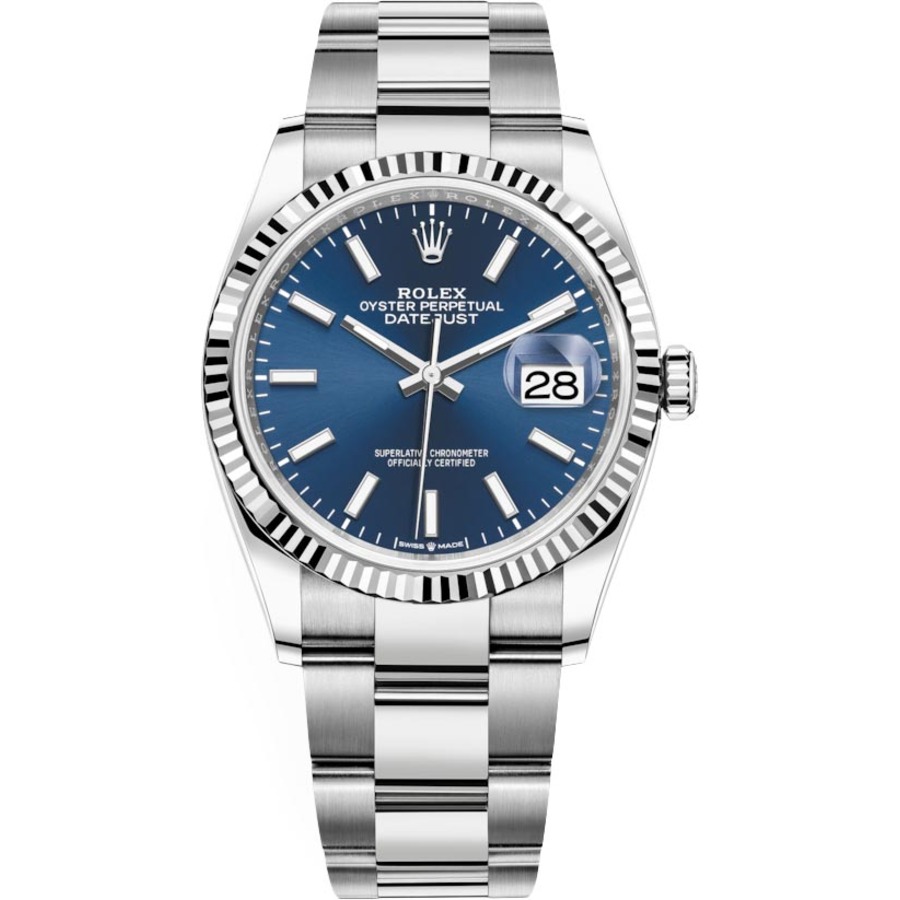 36mm Oystersteel case, screw-down steel back, screw-down crown with twinlock double waterproofness system, fluted bezel, scratch-resistant sapphire crystal with cyclops lens over the date, blue dial, index hour markers.