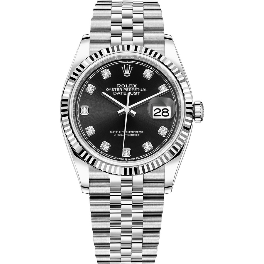 The Rolex Datejust 126234 36mm Silver-tone stainless steel case with a silver-tone stainless steel Rolex jubilee bracelet. Fixed, fluted white gold bezel. Black dial with silver-tone hands and diamond hour markers. Minute markers around the outer rim. Luminescent hands and markers. Date display at the 3 o’clock position.