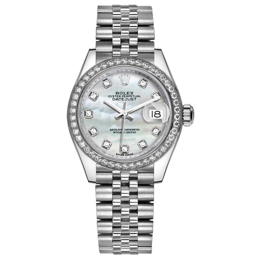 The Rolex Lady-Datejust 279384-0011 28mm Oystersteel stainless steel case. White mother of pearl dial with diamond hour markers. Polished white gold hands. Date window displayed at the 3 o’clock position. Set within a polished solid 18k white gold bezel adorned with diamonds. Powered by the self-winding Rolex Caliber 2236 movement.