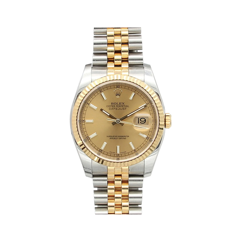 The Rolex Datejust 116233 36mm Stainless steel case with a stainless steel jubilee bracelet with 18kt yellow gold center links. Fixed fluted 18kt yellow gold bezel. Champagne dial with luminescent yellow gold-tone hands and luminescent yellow gold-tone index hour markers.
