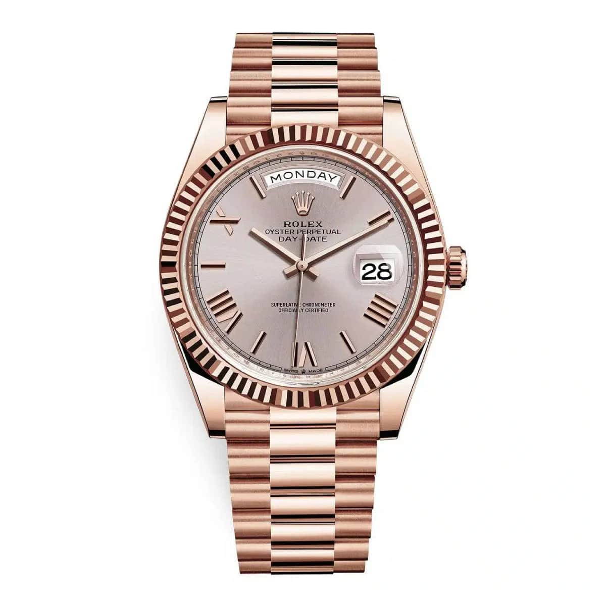 The Rolex Day Date 228235-0001 40mm 18K Everose gold case, screw-down back with Rolex fluting, screw-down crown with twinlock double waterproofness system, fluted bezel, scratch-resistant double anti-reflective sapphire crystal with cyclops lens over the date, sundust dial, baguette-cut diamond hour markers.